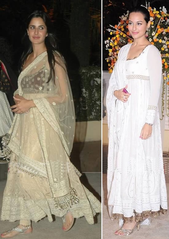 Katrina in a beige Tarun Tahiliani lehenga that we have seen her wear before, Sonakshi in a flowy white Anarkali and pulled back hair