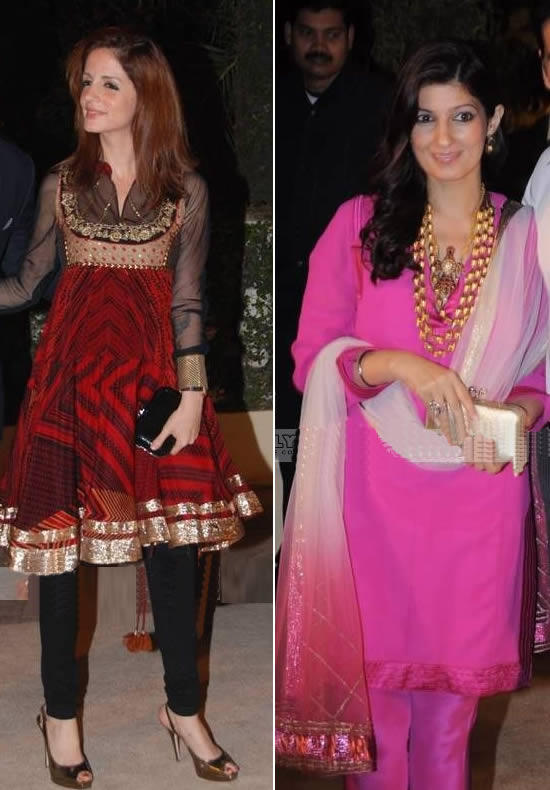 Sussanne Khan Roshan in a Ritu Kumar tunic. Twinkle Khanna in a deep pink ensemble, accessorised with a gold neck-piece