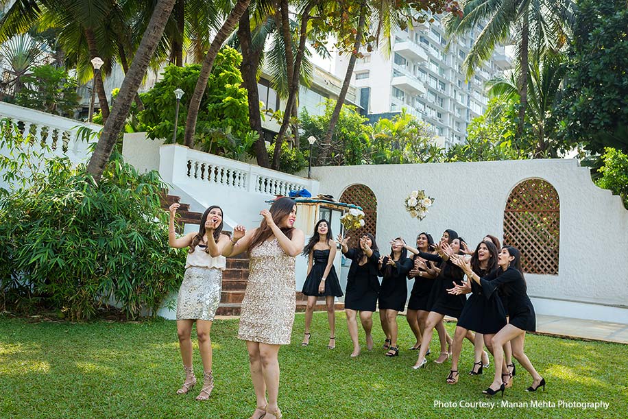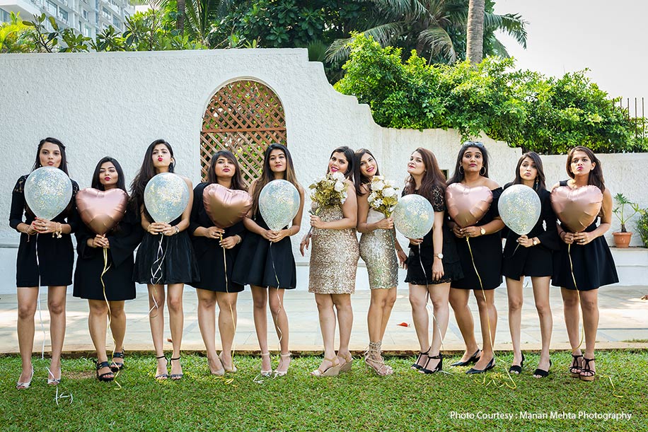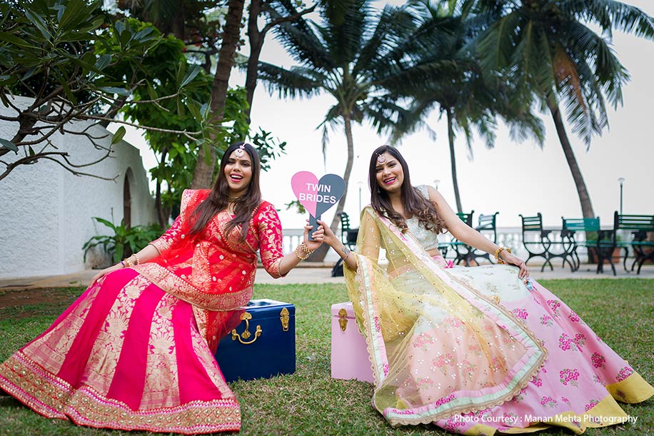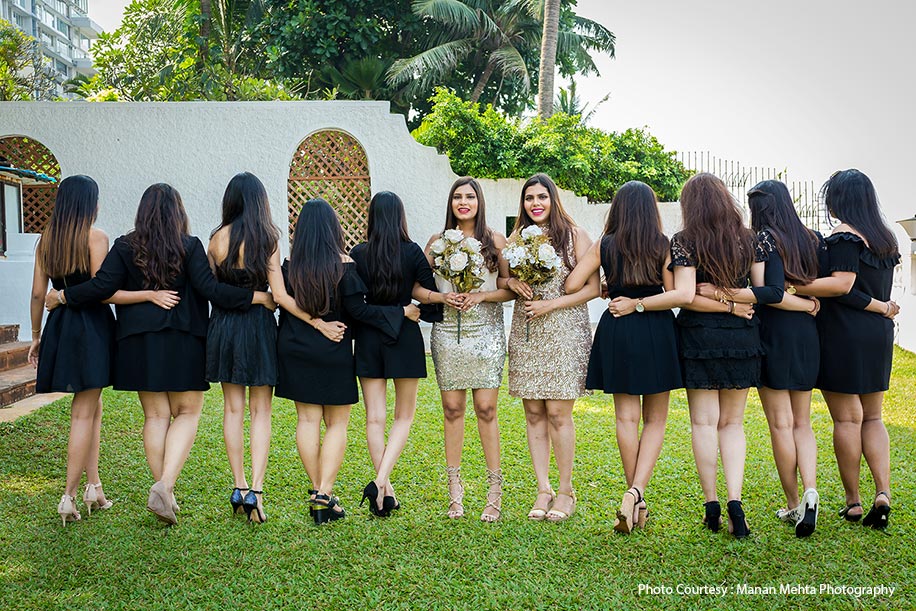“We decided on one Indian and one Western look, but at the same time ensured that the outfits would be something that our bridesmaids would easily find in their wardrobes. For the ethnic look, we asked everyone to wear ghagras, and for the next look, our bridesmaids wore their little black dresses while the two of us opted for blingy dresses. As for the props, we had a whole bunch of things such as placards, trousseau trunks, balloons, confetti and more. Live Love Surprise helped us customise these with phrases like ‘The Twins Wedding’, incorporated our wedding hashtag into the props. The bridesmaids’ favor boxes were made by Wedding Lounge by Urvi Sethi and the outfits for both of us were from Maitri Mehta Label. While our pretty faces were a result of Niyati Kothari’s efforts, our fun-filled memories were captured by Manan Mehta Photography”.