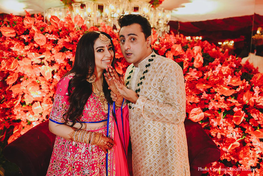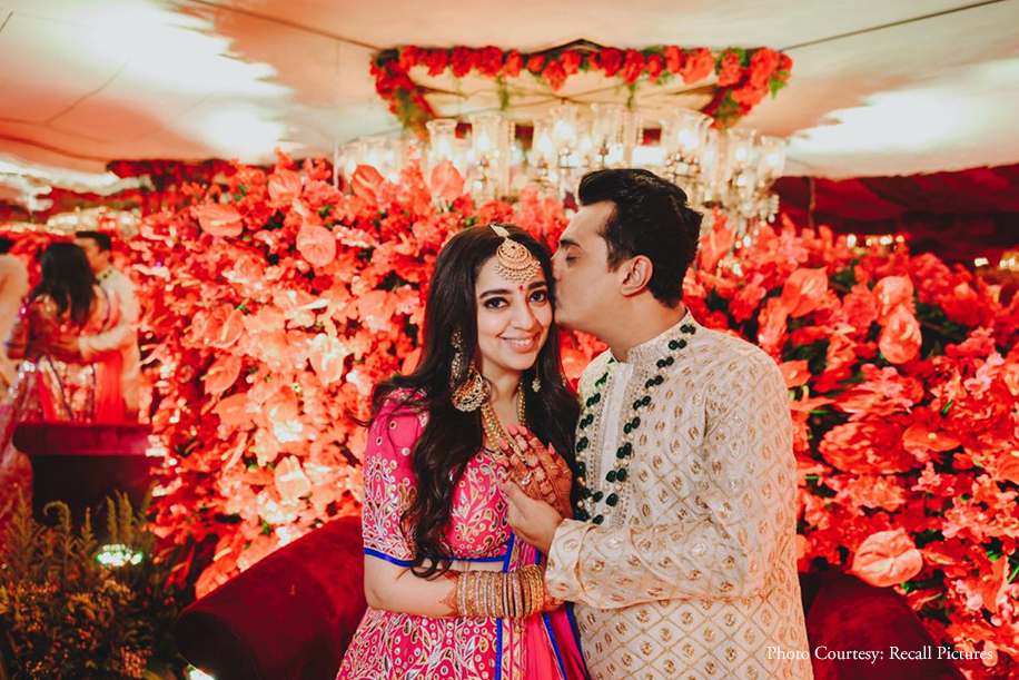 Dressed in a bright pink lehenga embroidered with reflective floral motifs, Nidhi glowed as she posed with Binoy. A statement kundan and pearl maang tikka, necklace and earrings accessorized her look while her long locks fell in luscious waves around her shoulders. Binoy, on the other hand, channeled his inner royal with a classic off white and gold sherwani.