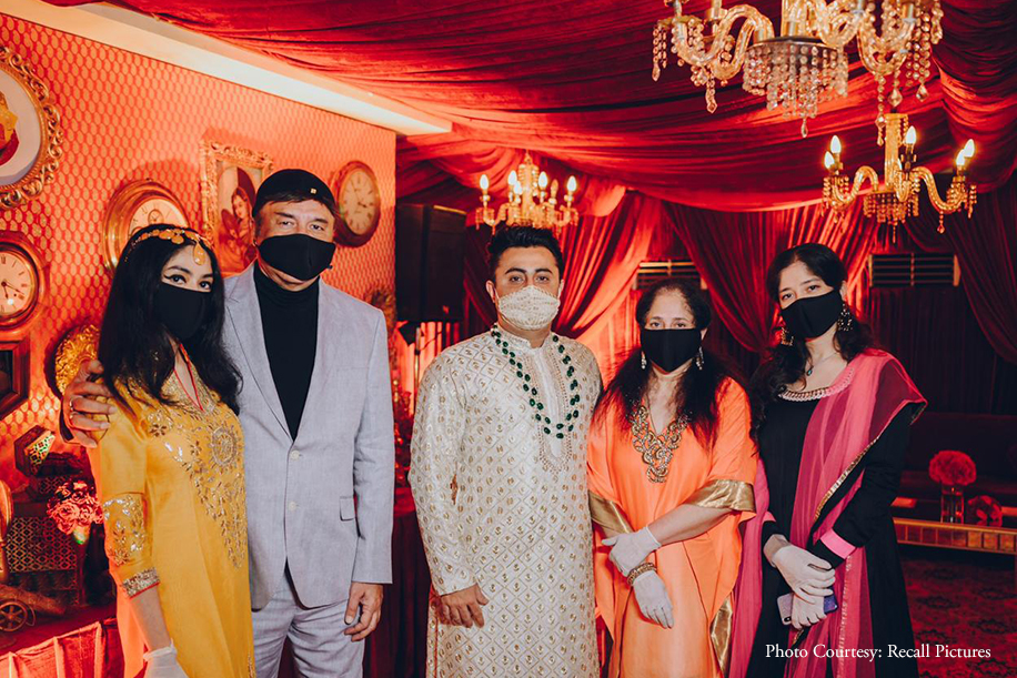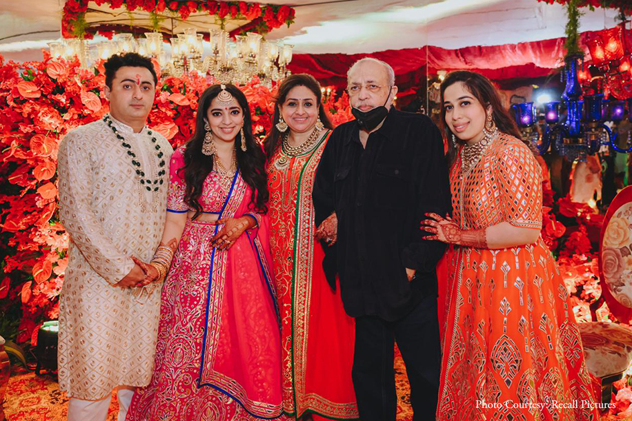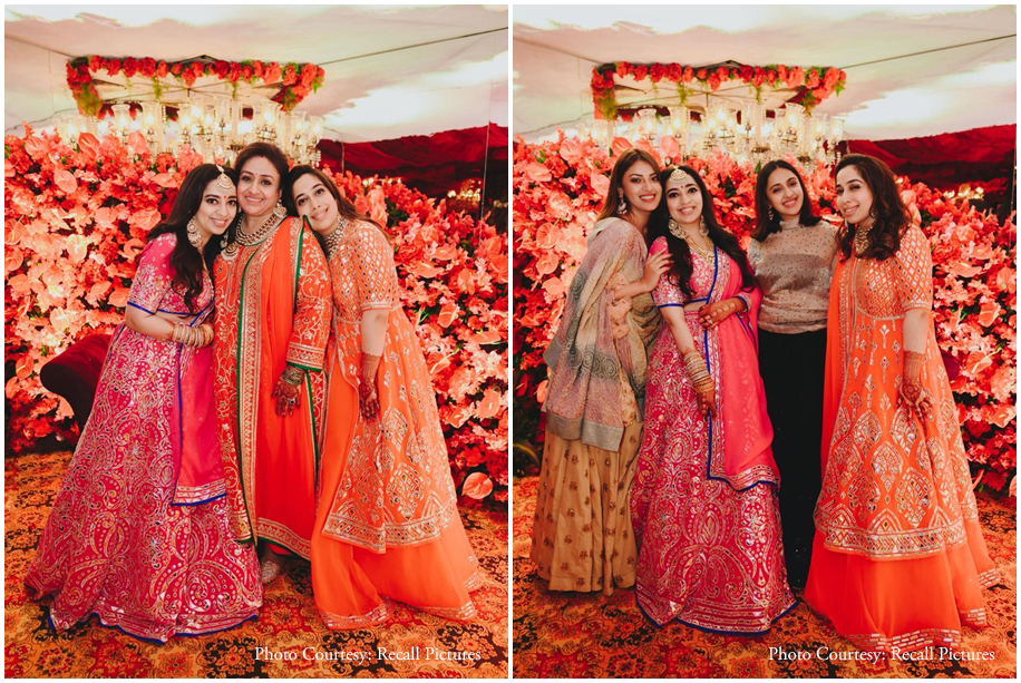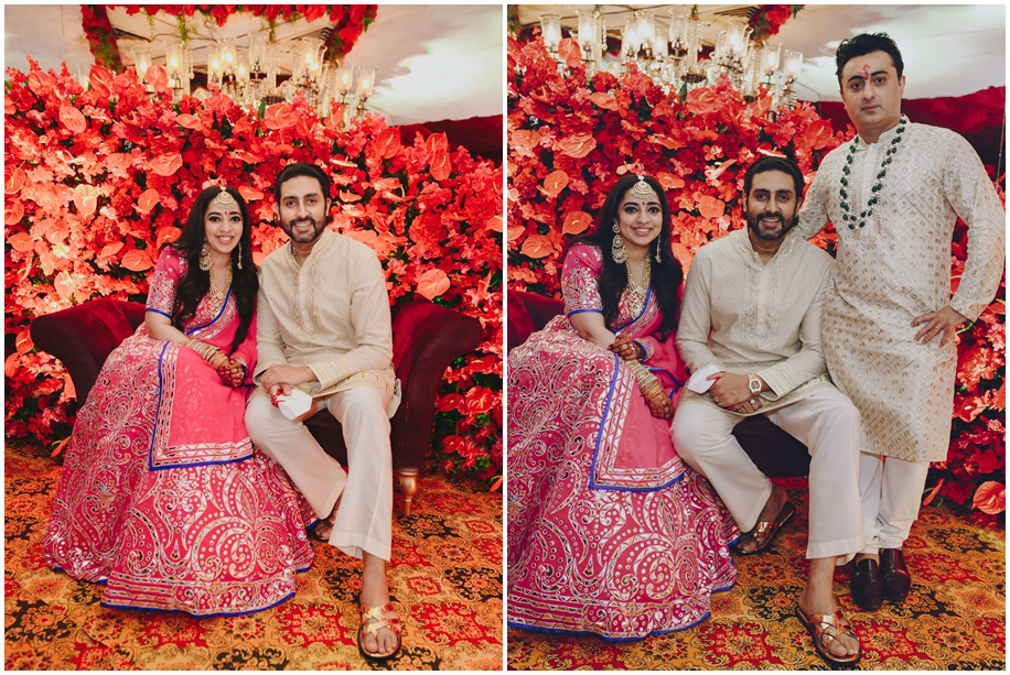 Attended by big names in Bollywood, guests included Nidhi’s close friend Abhishek Bachchan. The event was managed by WeddingSutra Favorite FB Celebrations and the decor was starry with luxurious red florals accentuated by velvet drapes and LED candles. Also present were composer Anu Malik and sisters Anushka and Akansha Ranjan who cheerfully posed with Nidhi and her sister.