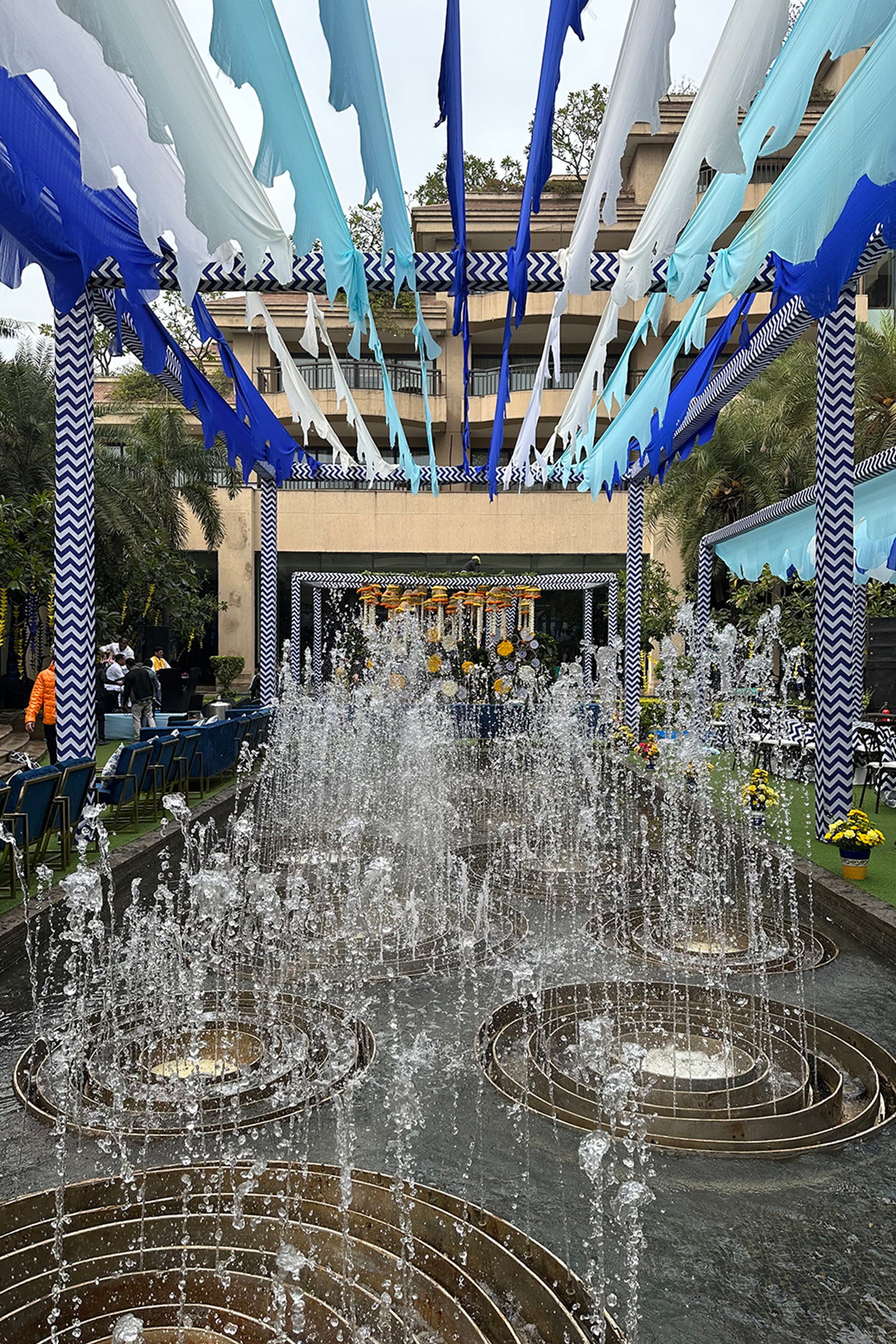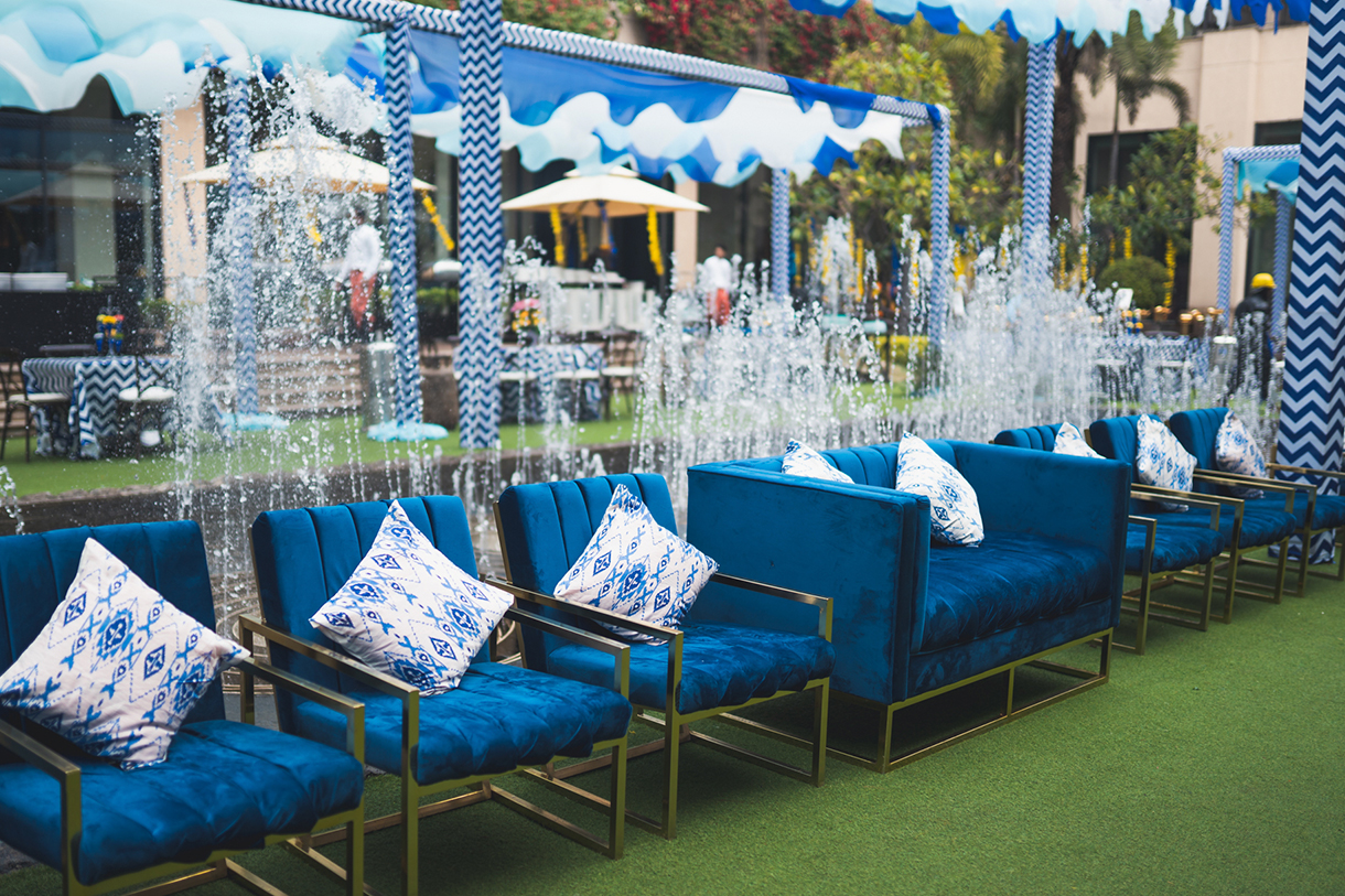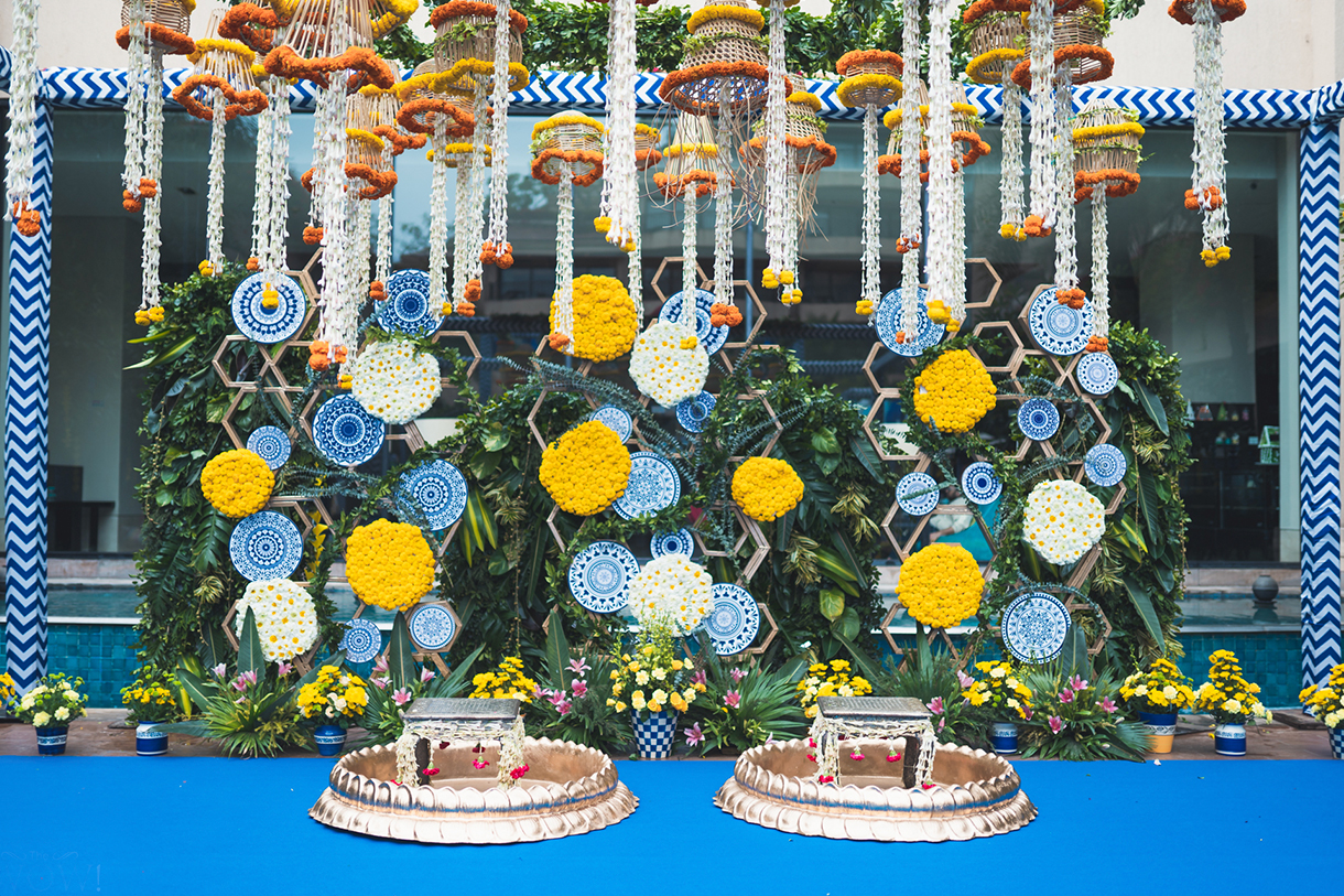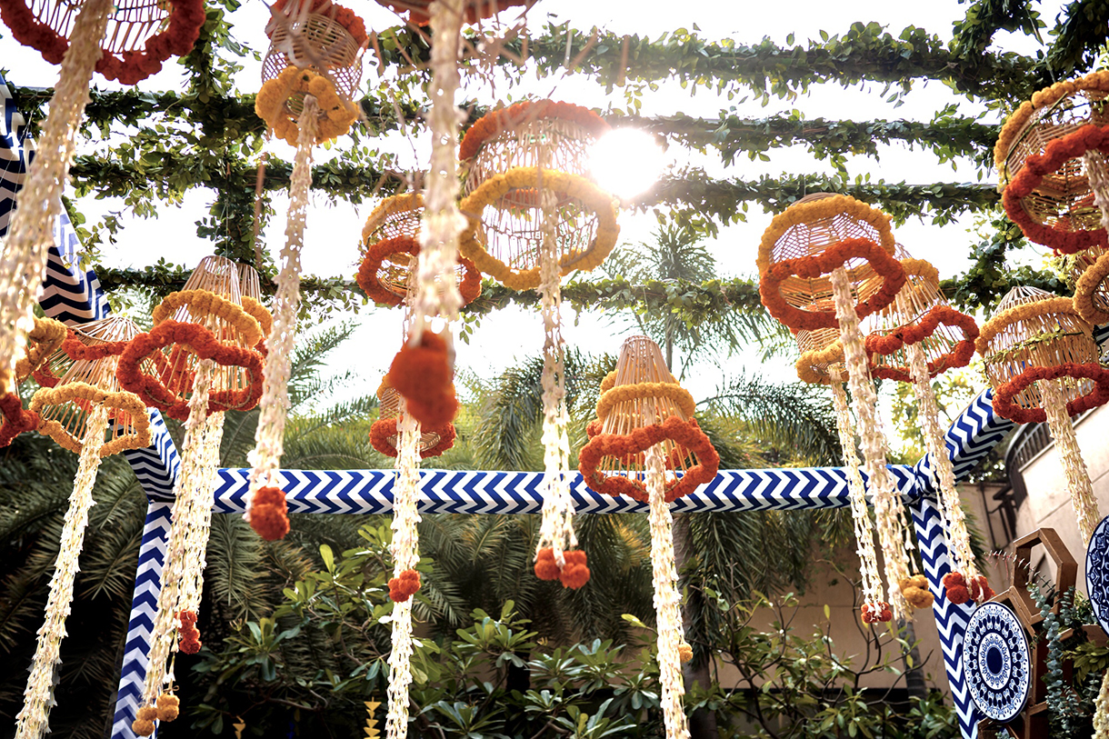 Next was the haldi where the couple chose an unconventional route by opting for shades of blue that were interspersed with yellow hues. Bride Anchal shares, “We didn’t want the usual all-yellow theme and hence, we went for a dash of blue to add that freshness to the venue. Plus, the blue also complemented the yellow outfits that everyone wore. Mandala art, suspended blooms, striped tablecloths and quirky wall hangings made for a refreshing change from the array of marigolds one usually sees at haldi events.”