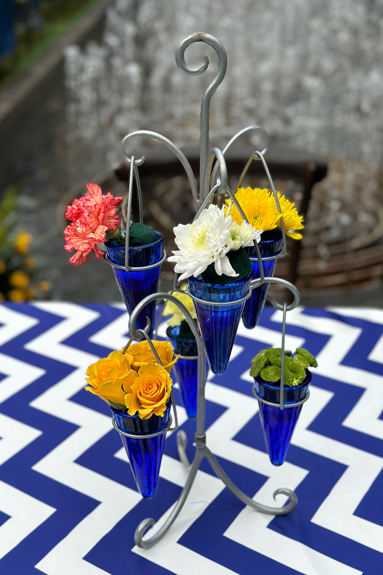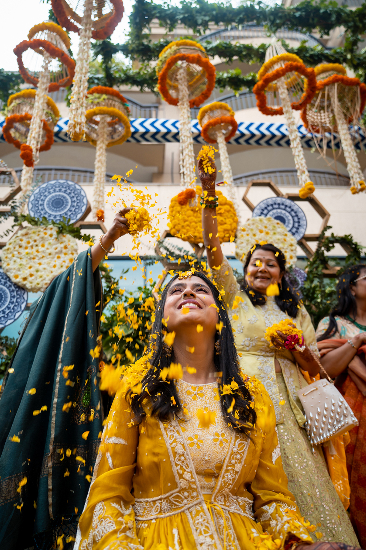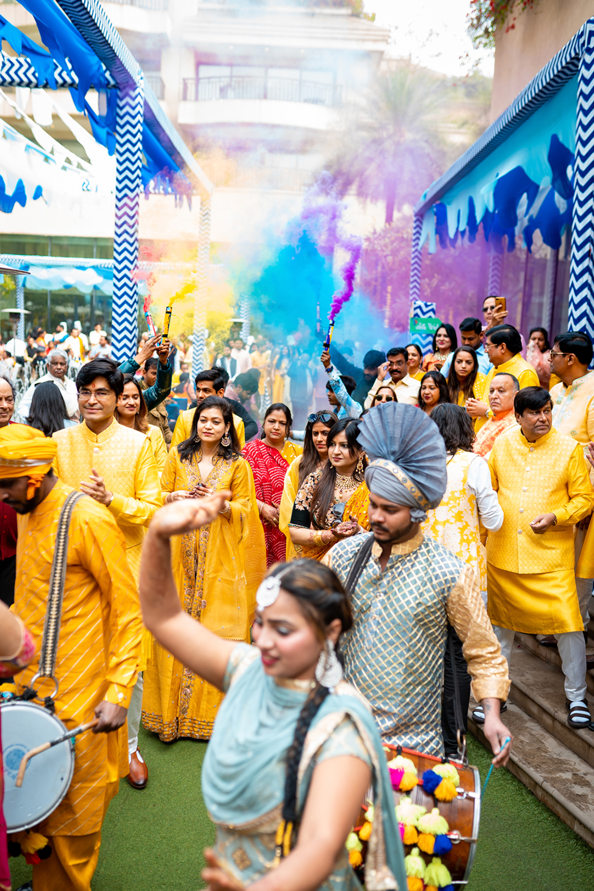 Next was the haldi where the couple chose an unconventional route by opting for shades of blue that were interspersed with yellow hues. Bride Anchal shares, “We didn’t want the usual all-yellow theme and hence, we went for a dash of blue to add that freshness to the venue. Plus, the blue also complemented the yellow outfits that everyone wore. Mandala art, suspended blooms, striped tablecloths and quirky wall hangings made for a refreshing change from the array of marigolds one usually sees at haldi events.”