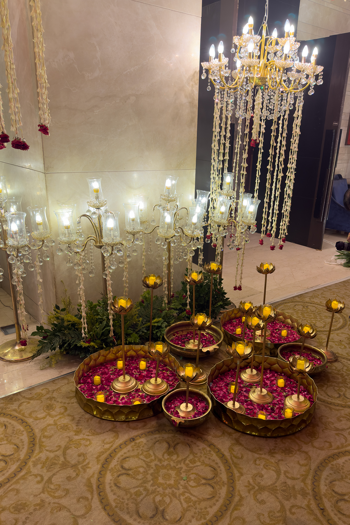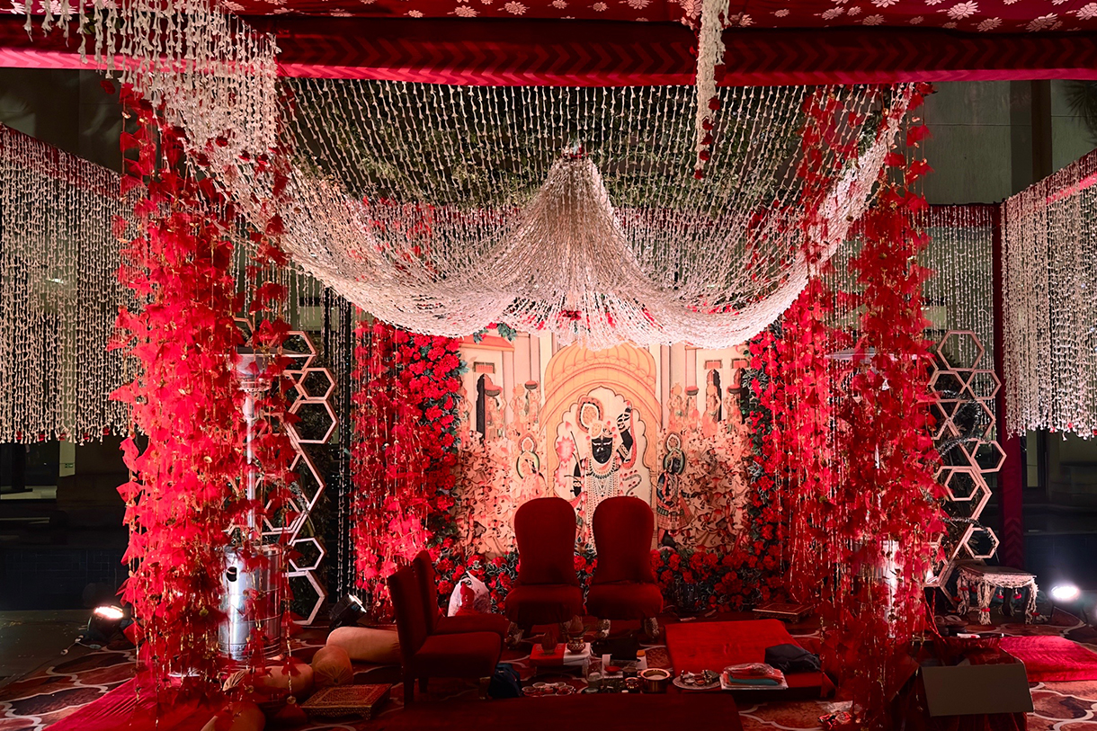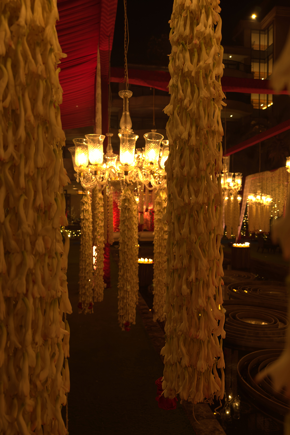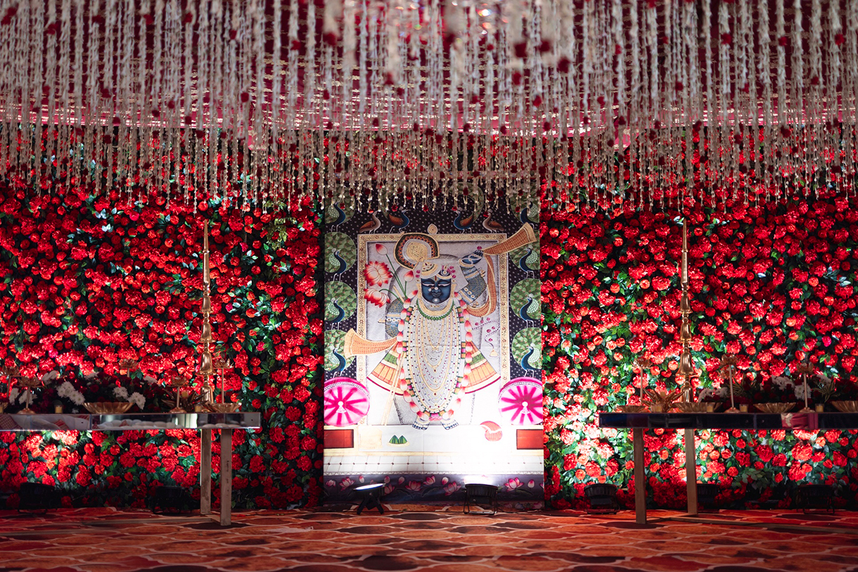 Planner Tanya shares, “For the big day, we went all in to give the couple the royal wedding they’d been dreaming of! A color palette of white and red was the first choice as it is a beautiful classic combination. Rajnigandha and roses were generously used throughout the outdoor venue. For opulence, we used chandeliers, ethnic lotus prints and rich scarlet fabric. An installation of Lord Shreenathji at the entry added auspiciousness to the evening.”