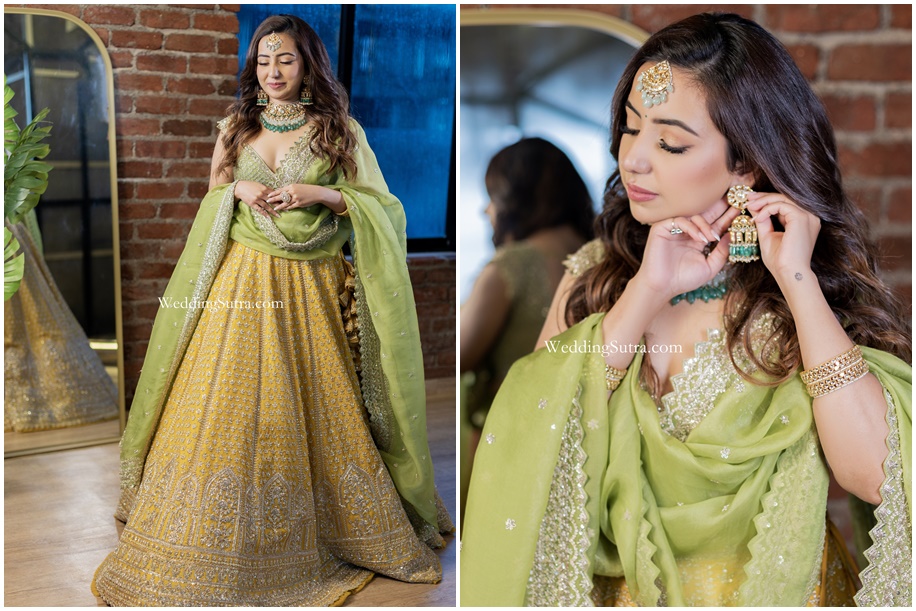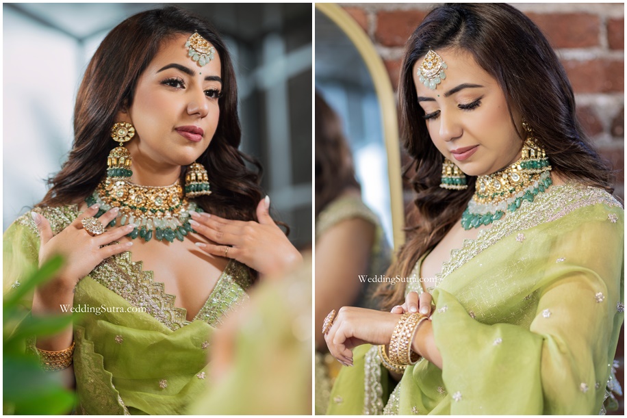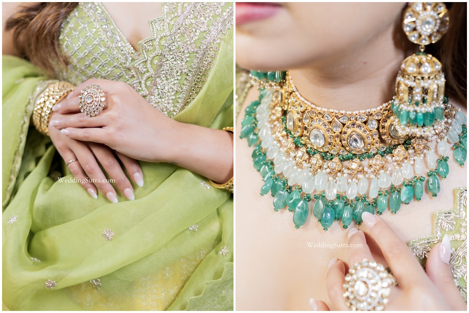 At her mehndi bash, the modern Indian bride is all about keeping the drama low and the fun high, ready to groove with her gang! Picking out classy Kundan and gold pieces from Rivaah by Tanishq, Shradha Luthra looked picture perfect sporting a statement polki choker featuring green teardrop stones, gold jhumkas, kundan bangles, a statement maang tikka, and captivating rings.
