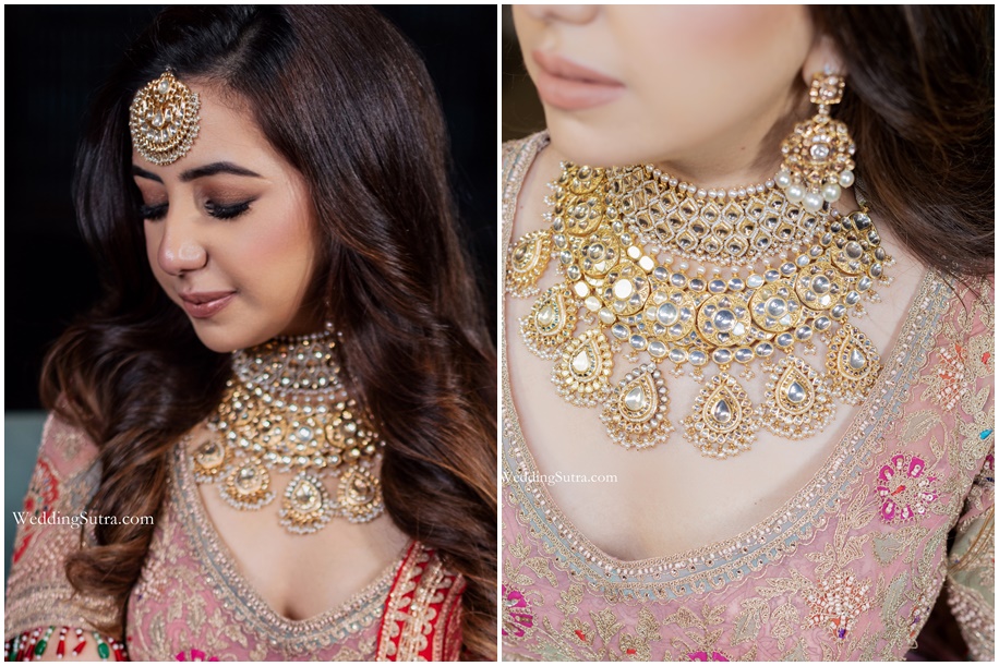 “Wedding jewelry serves as a timeless guardian of cherished memories, possessing immeasurable sentimental significance”, shares Shradha Luthra as she breaks down her look. Exquisite Polki creations with pearl detailing express a timeless allure while maintaining an overarching sense of luxury. Her choice of layered necklaces offers an artistic solution to create a rich look while opting for pieces you can re-wear, while her statement maang tikka, breathtaking haathphools, and kadas exude grandeur that commands attention.