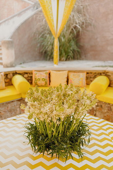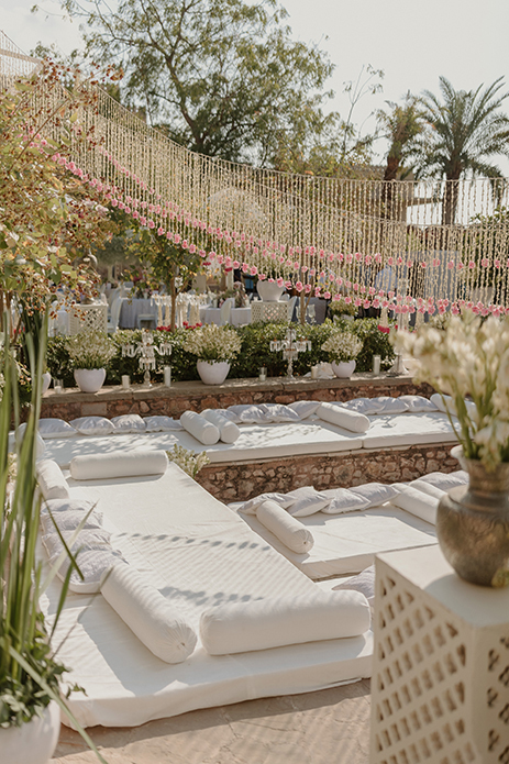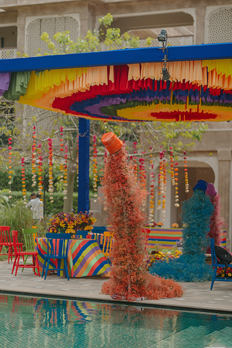Hosted around the month of March which is marked by the festival of Holi, the wedding kicked off with a welcome party which was themed around the festival of colours. Farid shares, “The Welcome Party was extremely colorful exuding an almost carnival-like feel. The sunshine made the colours stand out and the stone exteriors of the venue cut a perfect contrast. Festooned canopies, striped tablecloths, multi-coloured chairs and garlands ensured guests felt refreshed after their flights.”