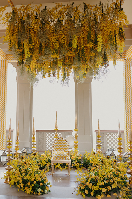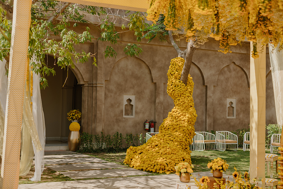 Next in line was the haldi which was, true to tradition, swathed in hues of yellow. Bhavnesh shares, “For the haldi, we used copious amounts of marigolds in creative setups. They were draped around trees, placed in vases and were even used as the backdrop for the couple’s seating. Sunflowers were also used alongside the marigold blooms. Overall, the atmosphere radiated warmth and positivity evoking a sense of unity and harmony.”