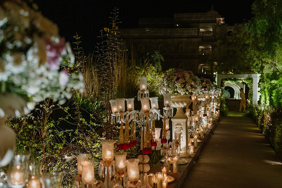 For the wedding, grandeur took the front seat as white and pastel hues dominated the decor palette. Blooms, like, jasmine, roses, lotuses and tuberoses were used while the furnishings were of a pristine white hue. To welcome the guests an arch decorated with baby’s breath roses decorated the entryway. And, as evening fell, the night was lit up by the glow of vintage lamps and candelabras.