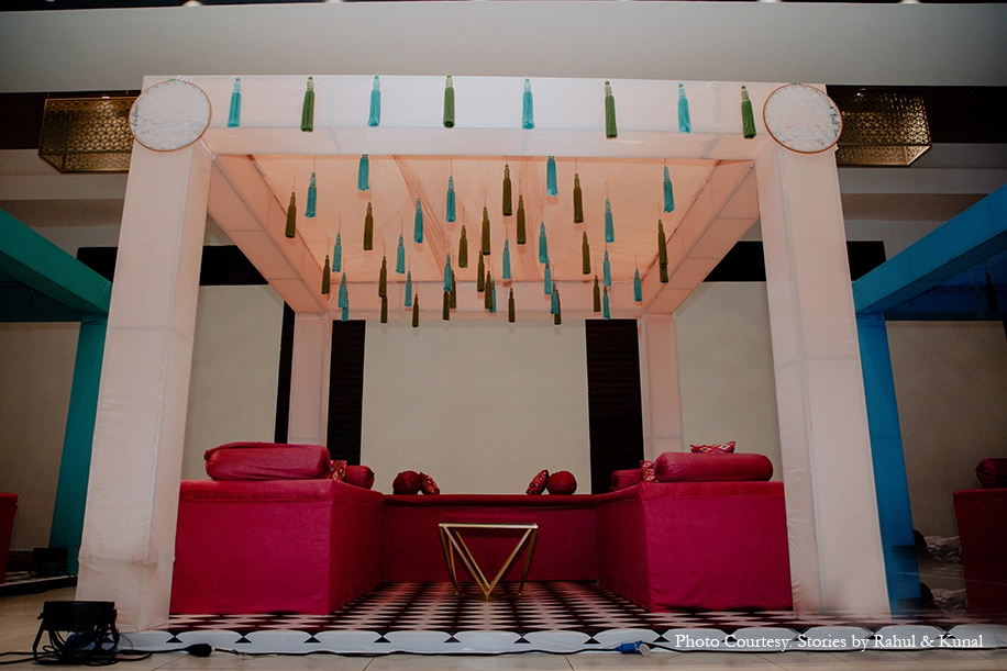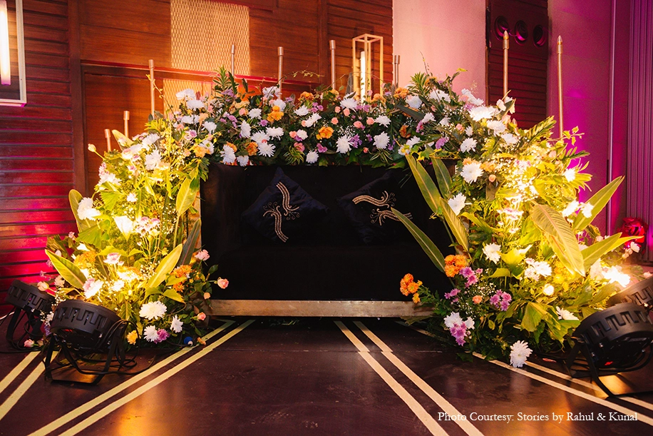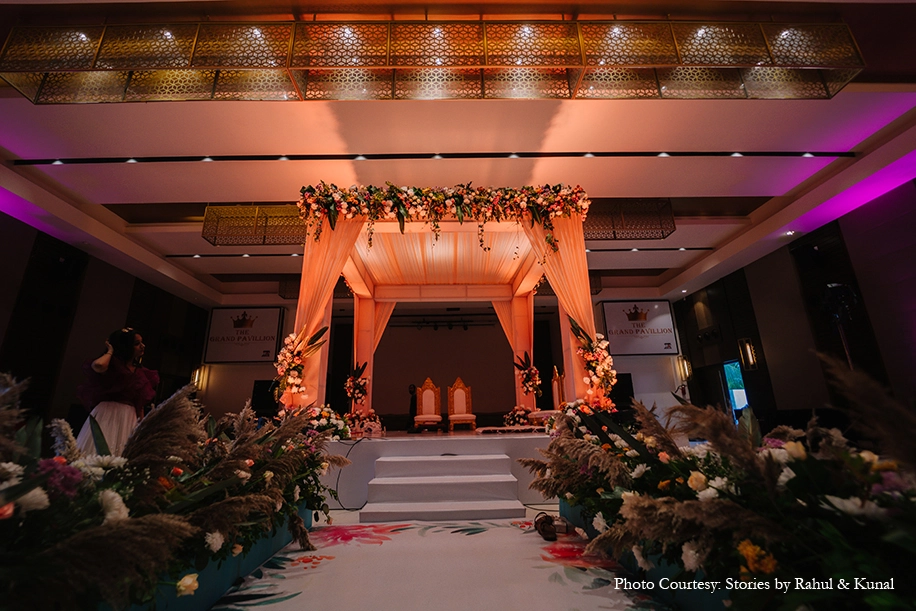 Originally conceptualized as a beach ceremony, the indoor wedding exuded all the charm of a tropical outdoor function with the decor of breezy drapes, pampas grass, exotic blooms, and more, setting a boho, rustic ambiance. The bride made a beautiful entry under a canopy of dainty white and blush blooms for the outdoor varmala, before