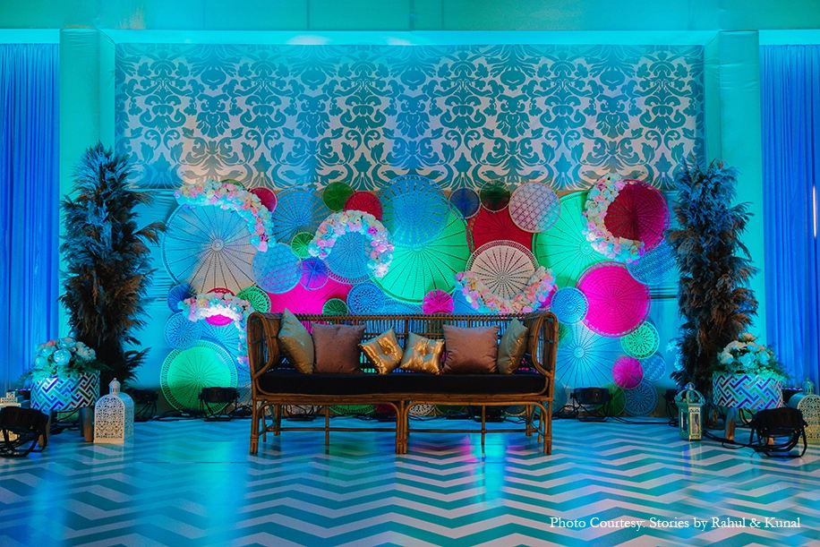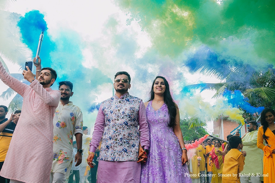Kicking off the festivities was the vibrant haldi and mehndi celebration. Designed in a uniquely cool color palette of greens, blues, and purples with boho elements like dream catchers, pampas grass, and cane furniture, the decor was a refreshing departure from traditional bright mehndi decor. Dressed in shades of lavender, the couple entered amidst colorful smoke bombs.