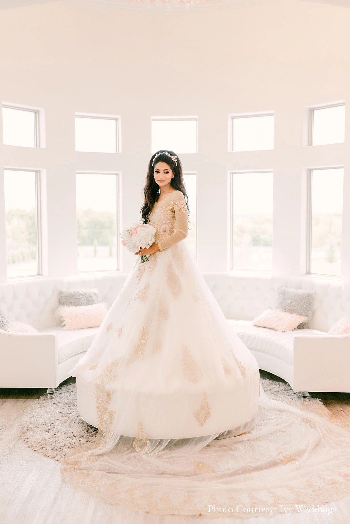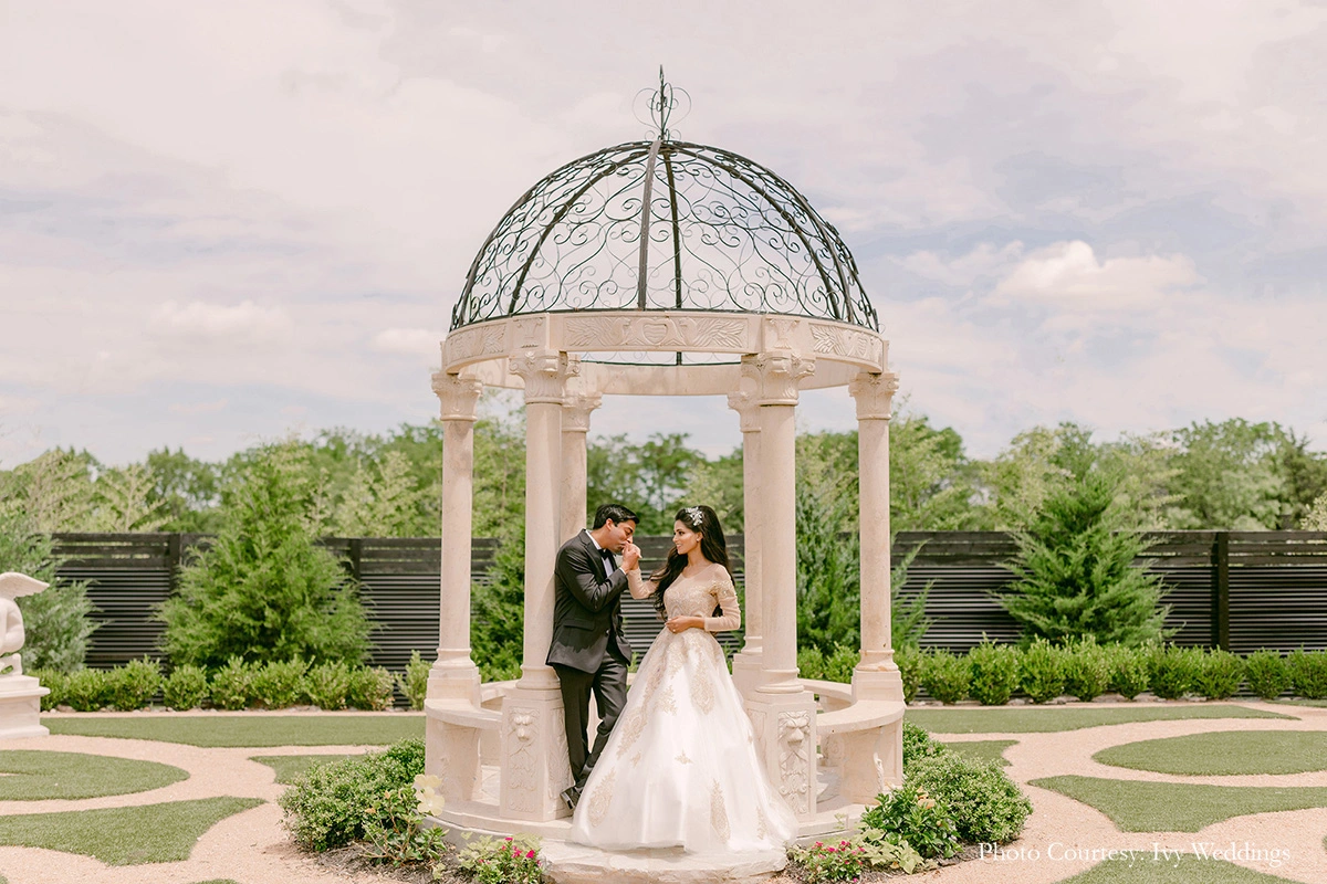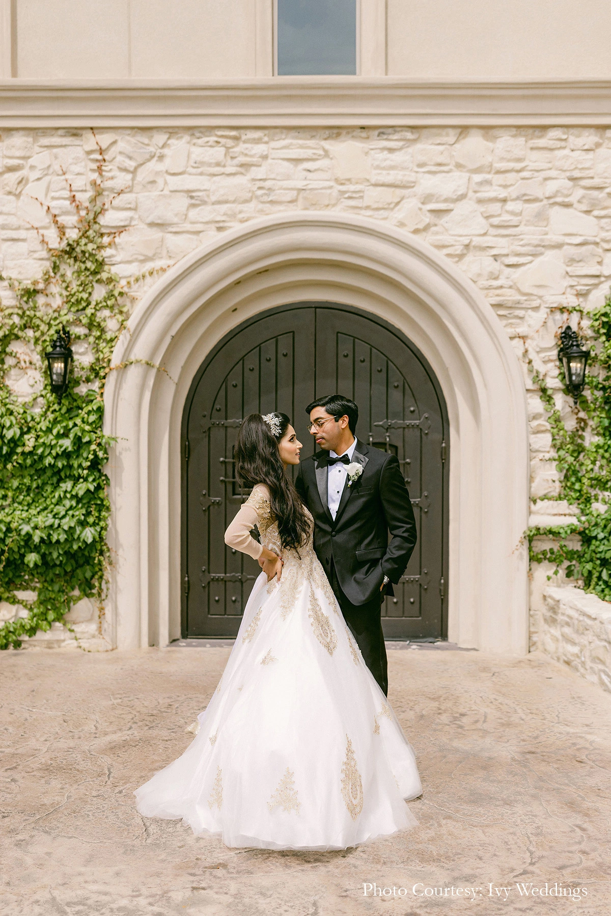 Since the couple could not hold a formal engagement due to the Pandemic, they made the most of their engagement shoot by incorporating different themes and concepts that celebrated their tastes, bond, and their heritage. “We did not have any theme in mind, so each shoot took a life of its own and had its theme and mood depending on our location and wardrobe. Some pictures felt very regal, some like a fairytale, and others ethereal, but the underlying theme for all our shoots was love. The wardrobe helped set the stage for each location. We opted for an evening cocktail vibe for the city shoot, and white wedding glam for our wedding venue. Traditional Indian attire made for the perfect choice for our temple shoot.”