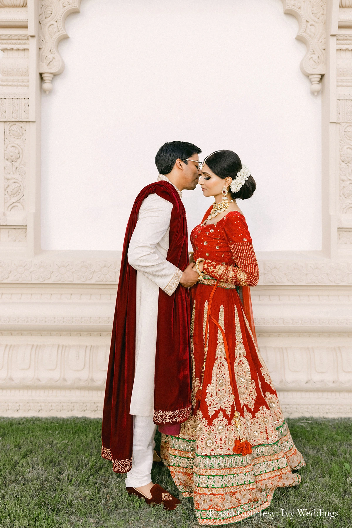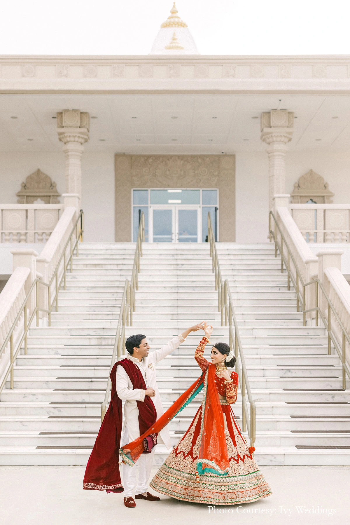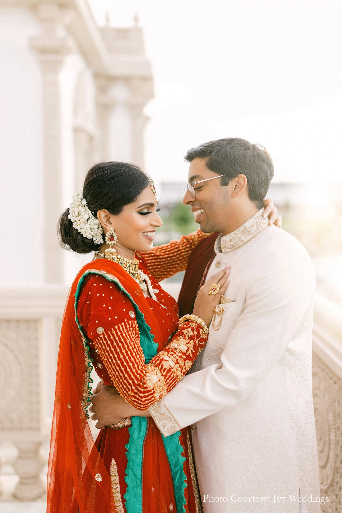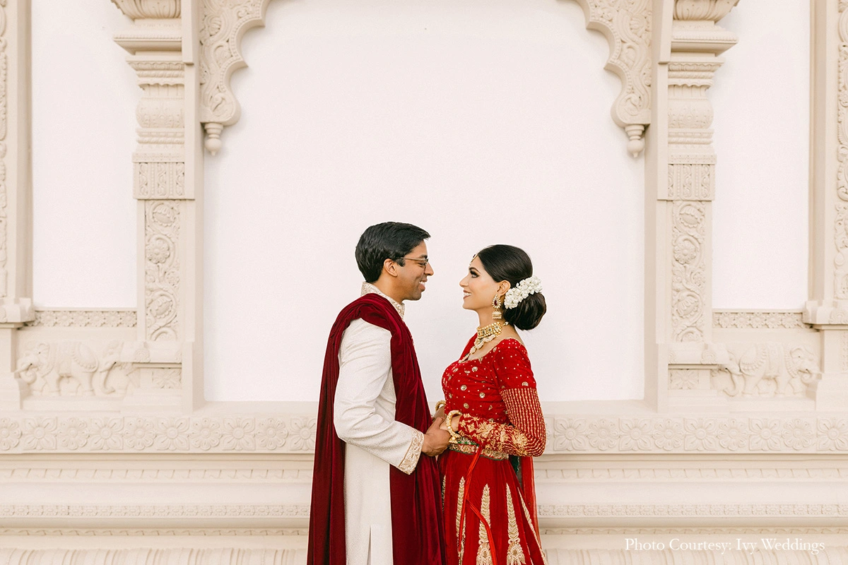 Ramya shares, “I had a vision of what I wanted the shoot to be like, and our photographers from Ivy Weddings helped make it into a reality for us. We had a total of 4 shoots with different outfits and locations, and each shoot was magical. We held our first shoot at a place downtown to commemorate the place where our love had started and bloomed, while another was at our wedding venue to honor the place where we would be united forever. Since the wedding celebration would be hectic, it also gave us a chance to enjoy the place and spend some quality time together. Our last shoot at the temple was held at sunset, the experience of which was so dreamy and special we often forgot we were shooting”.