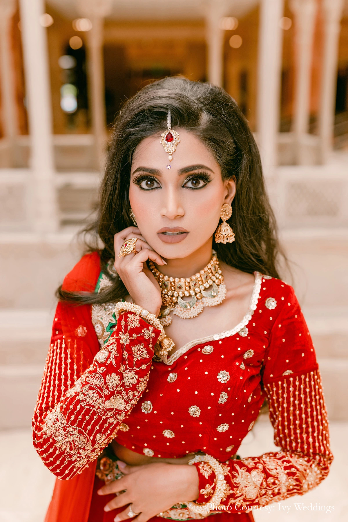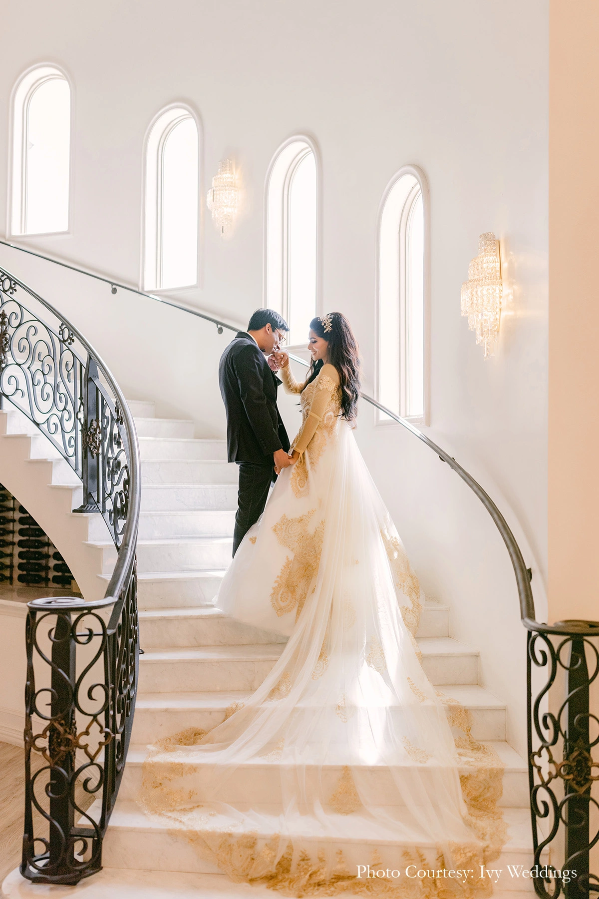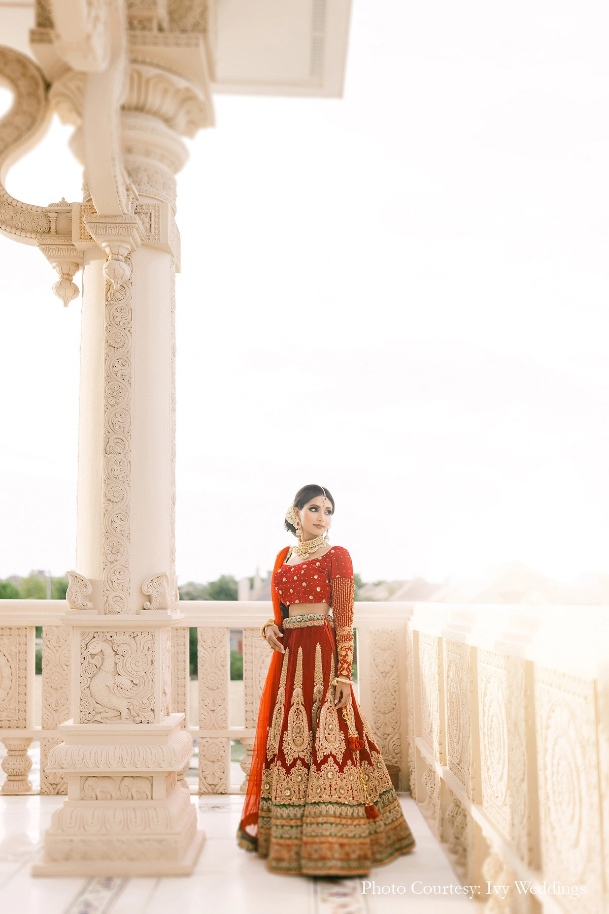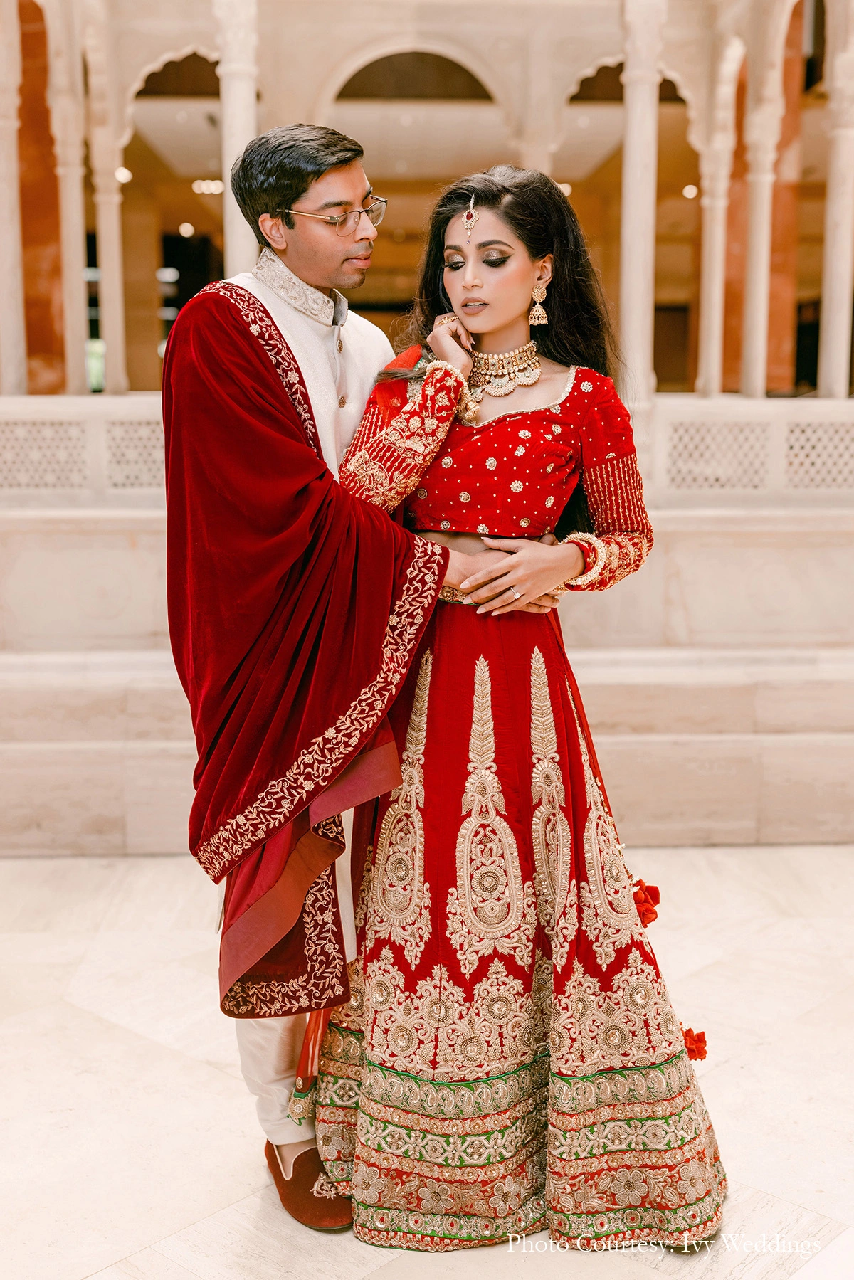 Ramya shares, “I had a vision of what I wanted the shoot to be like, and our photographers from Ivy Weddings helped make it into a reality for us. We had a total of 4 shoots with different outfits and locations, and each shoot was magical. We held our first shoot at a place downtown to commemorate the place where our love had started and bloomed, while another was at our wedding venue to honor the place where we would be united forever. Since the wedding celebration would be hectic, it also gave us a chance to enjoy the place and spend some quality time together. Our last shoot at the temple was held at sunset, the experience of which was so dreamy and special we often forgot we were shooting”.