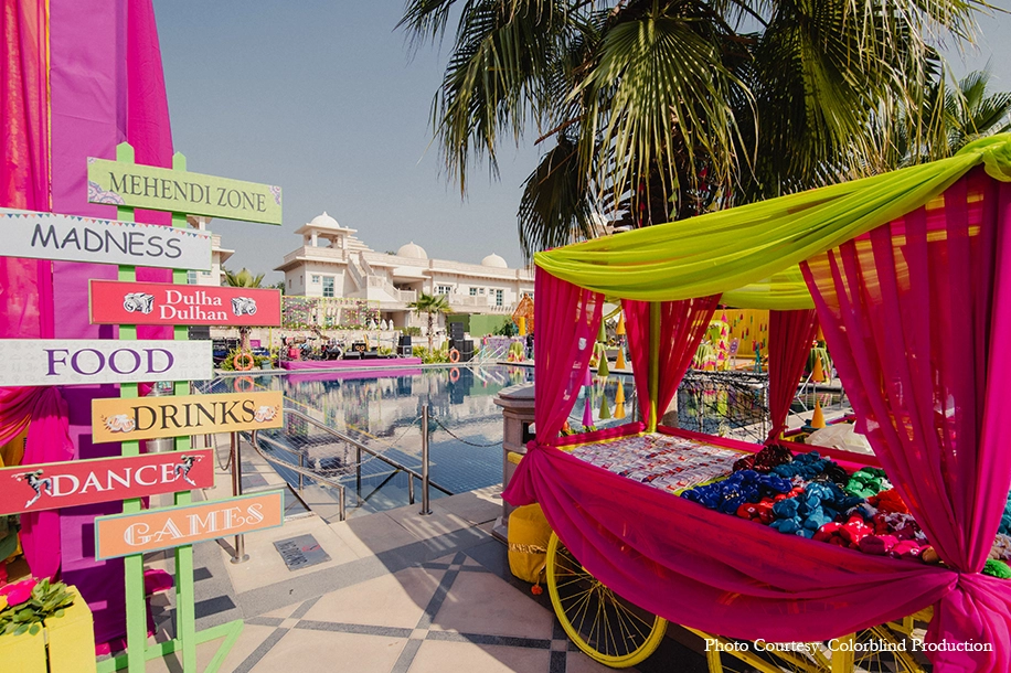 To create the perfect Rajasthani – Punjabi Mehndi, a vibrant carnival themed celebration was held at the beautiful poolside venue of the hotel. The bright hues of orange, pink, yellow and parrot green painted a pretty picture against the pristine facade of the hotel. Larger than life graphics, quirky props, interactive stations, a floral fiesta and a variety of artists all added to the festivities. With elaborate floral pieces and a trailing floral design, a stunning yellow swing made up the bridal seating and was accentuated with personalized cushions bearing the couple’s initials. An actual miniature ‘merry go round’ set the bar’s backdrop, small counters for games and wedding favors created an authentic carnival like experience. The band ‘Rocknaama’ dazzled all with their performance, while dholwalas and fabulous tunes by the DJ had everyone grooving.
