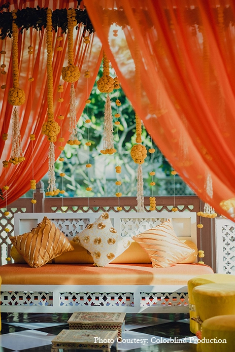 For the Haldi, a function very close to the bride’s heart, she had a vision of a palace-like setting. The beautiful gazebos at ITC Grand Bharat’s Yamuna Ghat was the perfect venue for an intimate celebration that exuded a royal vibe. The intricate architecture was decorated in vivid yellow and orange hues, with soft drapes, marigold garlands and simple centerpieces. Cozy traditional seating of diwans with cushions, bolsters and stools peppered the venue. A checkered black and white flooring struck a nice contrast.