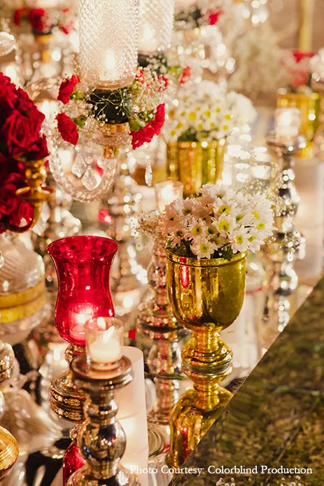 Hosted in an expansive space, the Reception reflected a creative, warm decor. A U-shaped structure was created for the seating to keep warm in the cold night air with an uninterrupted view of the property’s architecture. An abundance of chandeliers hung from a royal red shamiana casting a warm golden glow over the red and gold decor, the dining set up and other furniture present. Ornate centerpieces in golden vases added a decadent touch. The highlight however was the stage where the couple sat on a plush sofa in front of vertical light installations that looked phenomenal against the backdrop of the hotel.