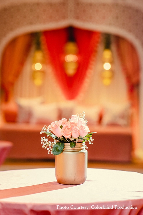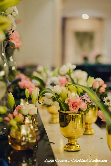Hosted at the Agni Ballroom, the Sagan was an intimate affair with just the close family that kickstarted the celebrations. A soft peach and ivory palette was chosen to highlight the rich wooden walls and jewel toned carpeting, offset by an abundance of ivory elements inspired by Moroccan aesthetics and architecture. Ivory diwans, coffee tables, drapes and cushions added a contemporary lightness to the occasion, while the beautifully crafted bride’s mehndi seating took everyone’s breath away. Delicate floral accents in soft peach and pink finished the look.