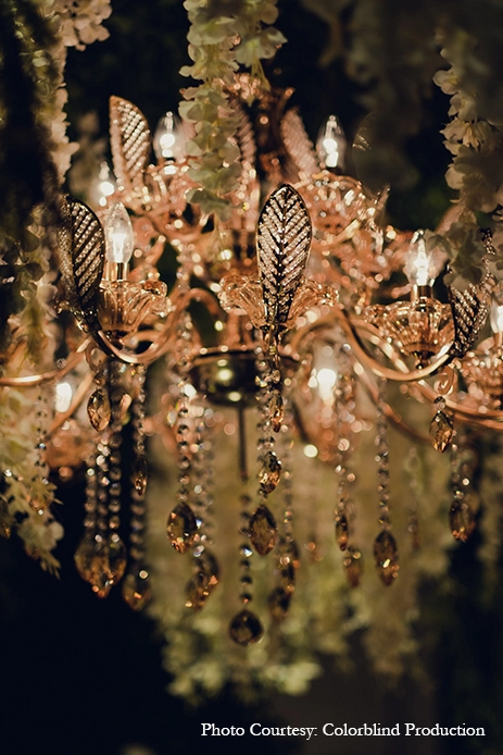 The Sangeet ceremony was designed with an enchanted forest theme, to make the most of the ostentatious style of the grand Prithvi Ballroom, incorporating actual interior elements of the ballroom and two lounges that offered the intimacy that the event needed.