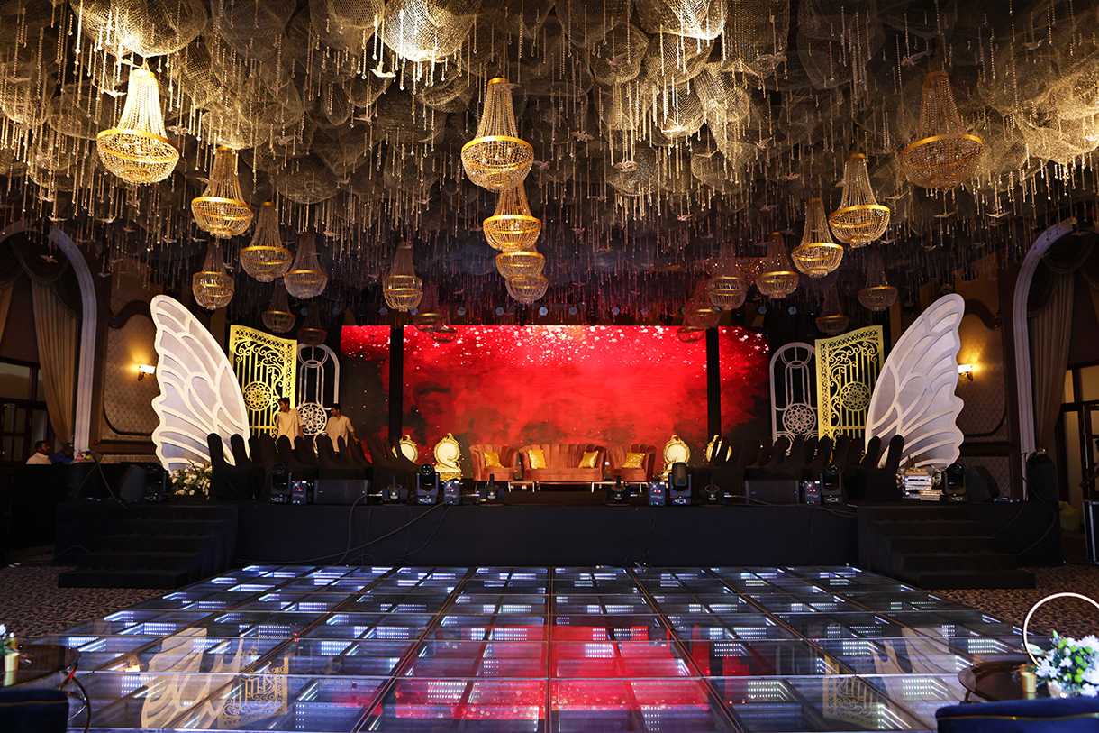 The venue was transformed into a Moroccan oasis with rich tapestries, lanterns, and low seating arrangements. And, the color palette featured deep reds, oranges, and golds.