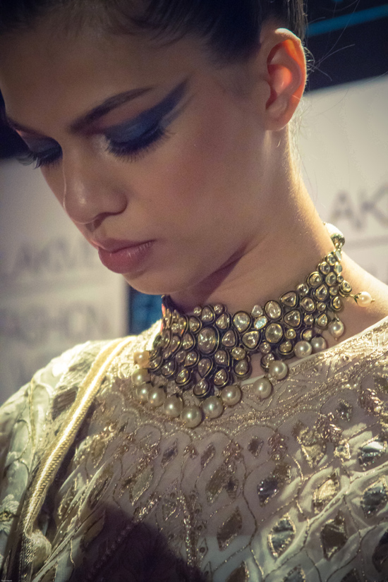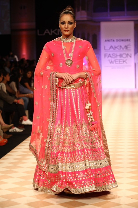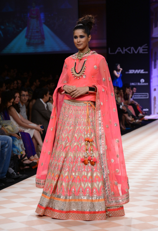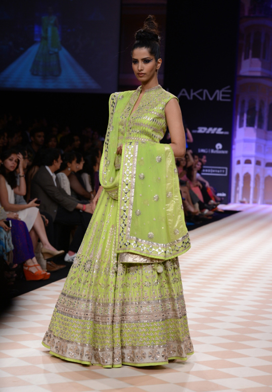 We were backstage with Anita Dongre, just before her show at Lakme Fashion Week. Amid all the action there, the designer spoke about her newest festive collection ‘Jaipur Bride 2013’ showcased there. Crafted on a musical collaboration with songstress, music producer and independent artiste Sona Mohapatra, the collection focuses on a bold, free and independent bride. Dongre explains: “Today’s Indian bride wants to celebrate her special day with her closest people, and have as much fun as her guests do. She wants to dance, move around, and the Anita Dongre Bridal Wear range allows you to do that instead of weighing you down.”