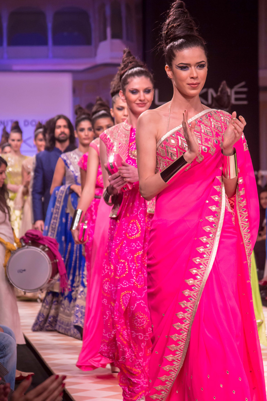 The colorful jackets and bridal lehengas that were seen in the collection featured innovative geometric patterns and motifs, reflecting Rajastan, the city from where the designer drives her inspiration.One of her all-time favorite pieces from this collection is the bandhani gown with the open bandi, a combination of her preferred print and trend in one.