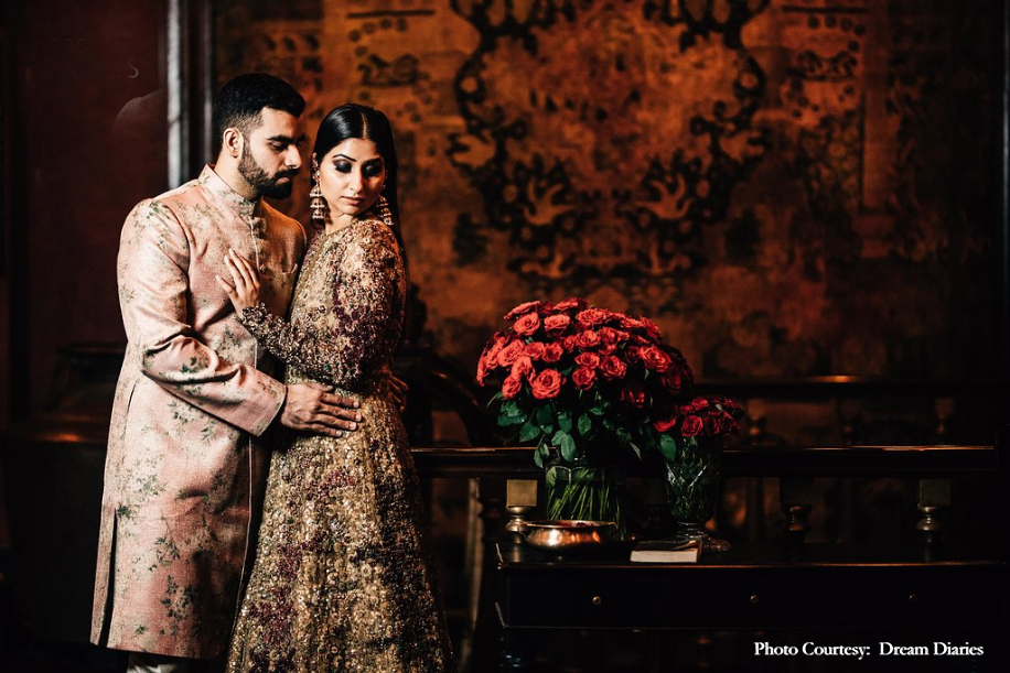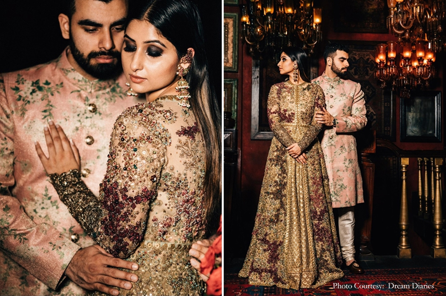 Ankita says, “We wanted to create a vintage theme. In resonance with the location aesthetics, I chose a gold patina jacket and Karan found a perfect contrast to my outfit, a pastel pink sherwani.”