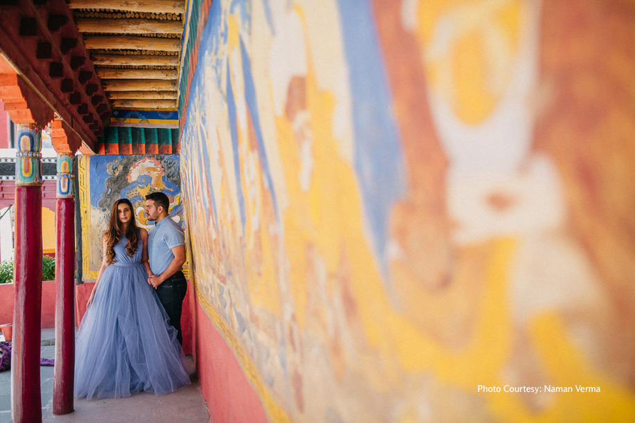 “The pre-wedding shoot results exceeded all our expectations! Our photographer and good friend Naman did an amazing job. We’d actually decided we’d like to take a trip to Ladakh before the wedding and realized that the only way that would happen is if we planned a pre-wedding shoot around that. We had no intention of some grand shoot and I started making plans with Naman. It was the perfect scenario because you are going to Ladakh with the love of your life and your best friend so it was bound to be fun! We started with plans for a 4-day trip and casual clothes which ended up being a 9-day trip with more than 70kgs of clothes. We packed our bags and set out for the trip of our lifetime! It was the best trip ever. There were actually no challenges and the results of the shoot were far better than we’d hoped for. It was fun and easy and we had the best food and the best time.”