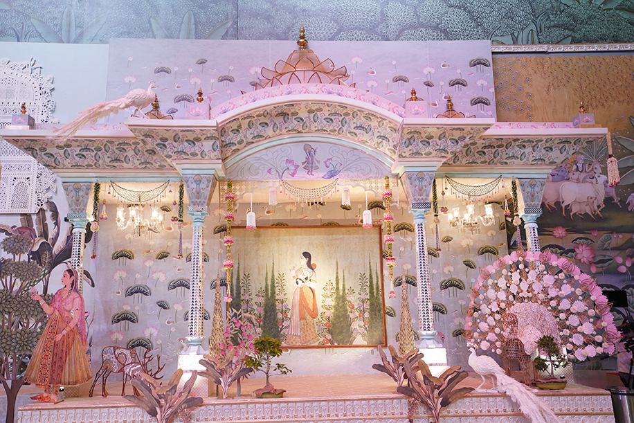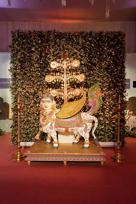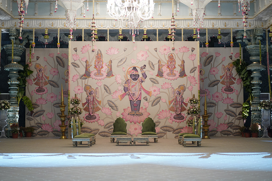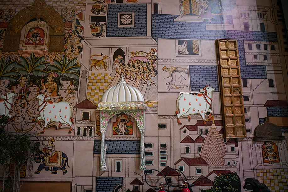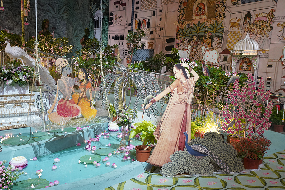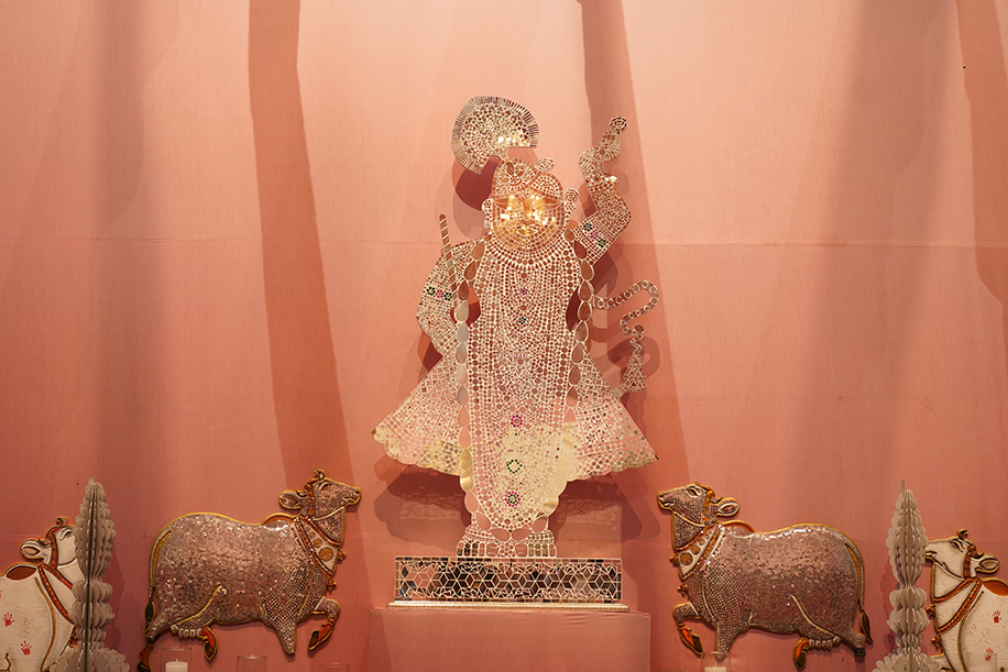For the structures, a cue was taken from the traditional temple architecture of India with ornate pillars and domed roofs. Plus, Pichwai cutouts featuring Lord Krishna and cows were strategically placed to tie back to the Vrindavan theme.