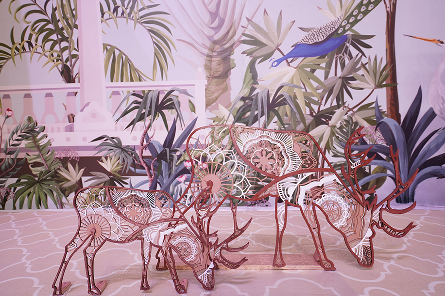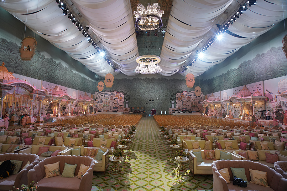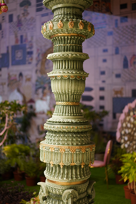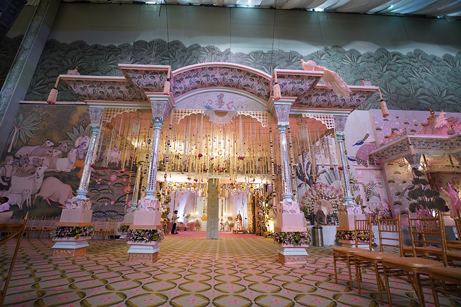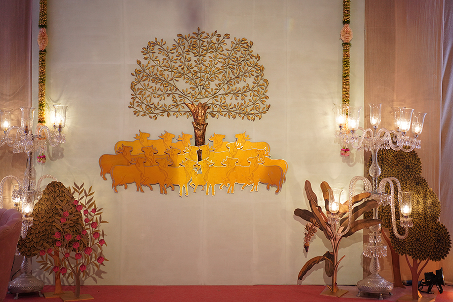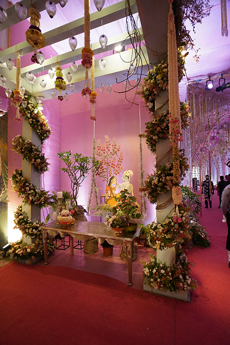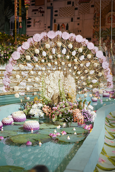 For the structures, a cue was taken from the traditional temple architecture of India with ornate pillars and domed roofs. Plus, Pichwai cutouts featuring Lord Krishna and cows were strategically placed to tie back to the Vrindavan theme.