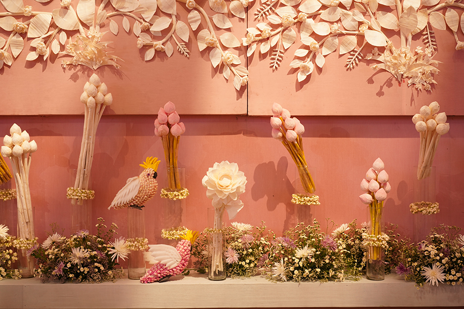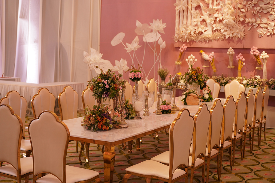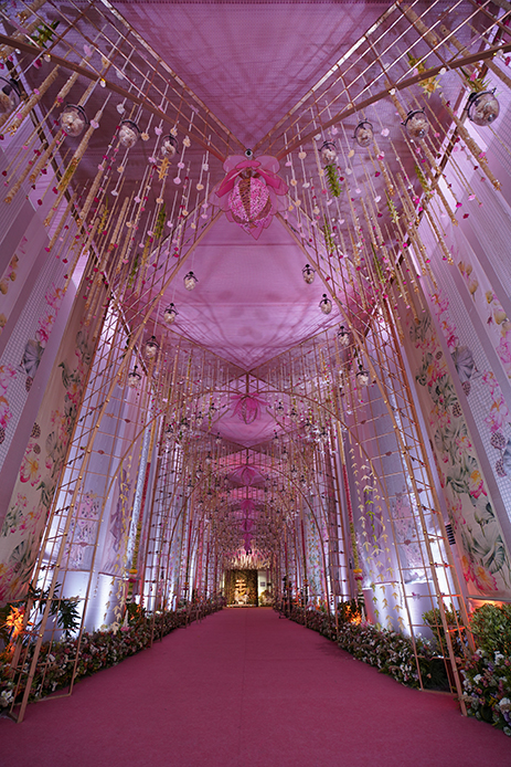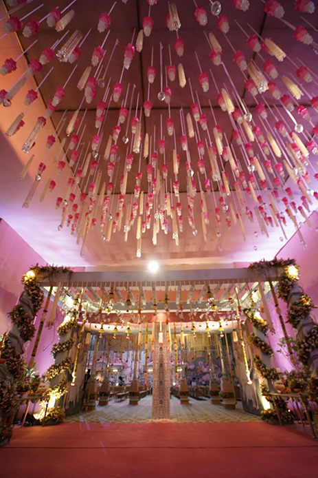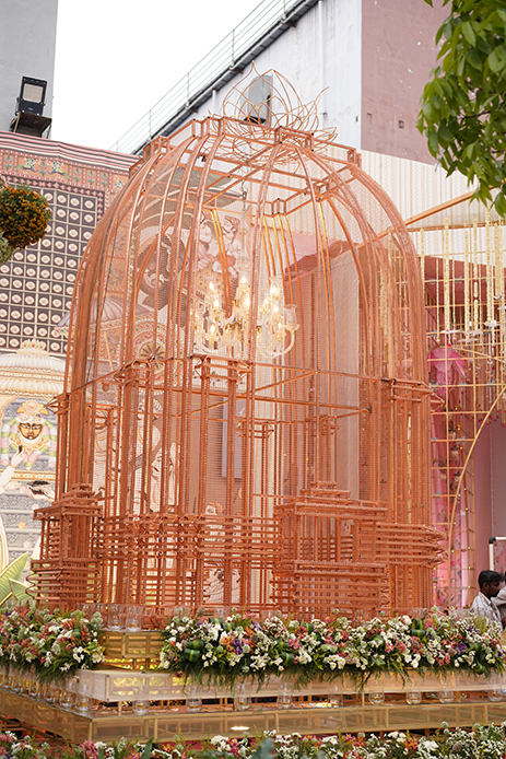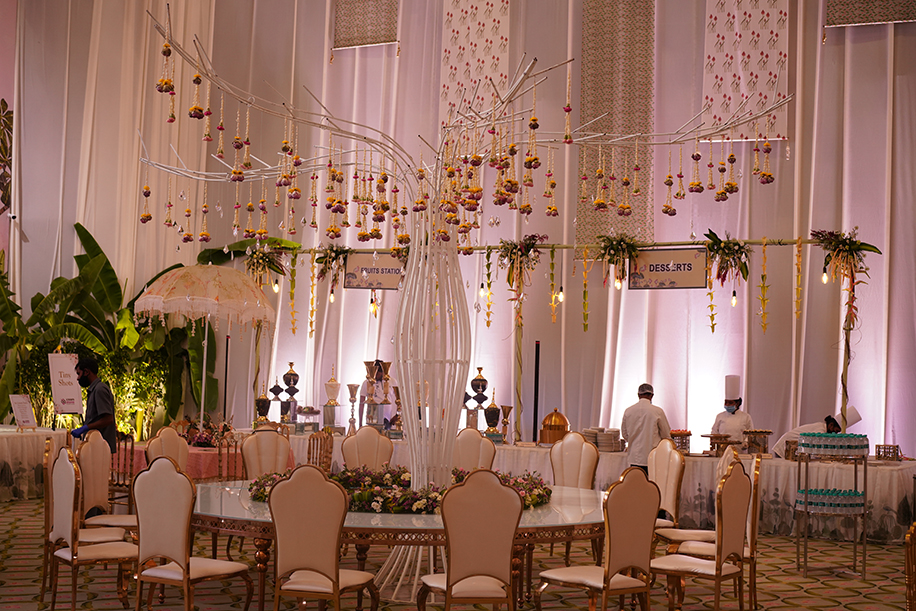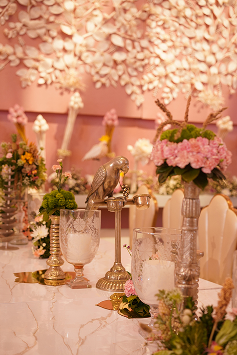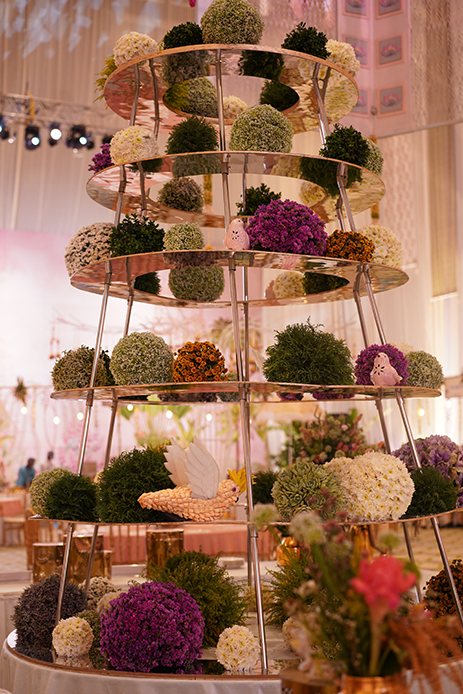 Featuring different flora, fauna and art forms that are unique to India, the wedding looked something out of a folktale storybook. Consistency in detail was key as the team used a plethora of hues and elements to ensure the guests were transported to a different world the moment they stepped into the venue. Larger-than-life floral arrangements, mirror work pillars, vintage paintings, artistic peacocks and deers and garlands crafted out of traditional Indian blooms completed the decor.
