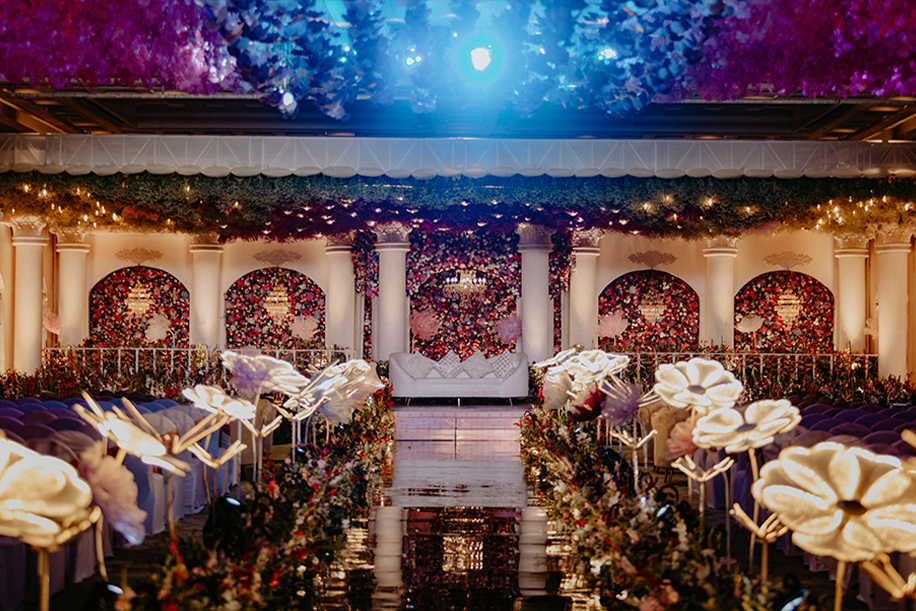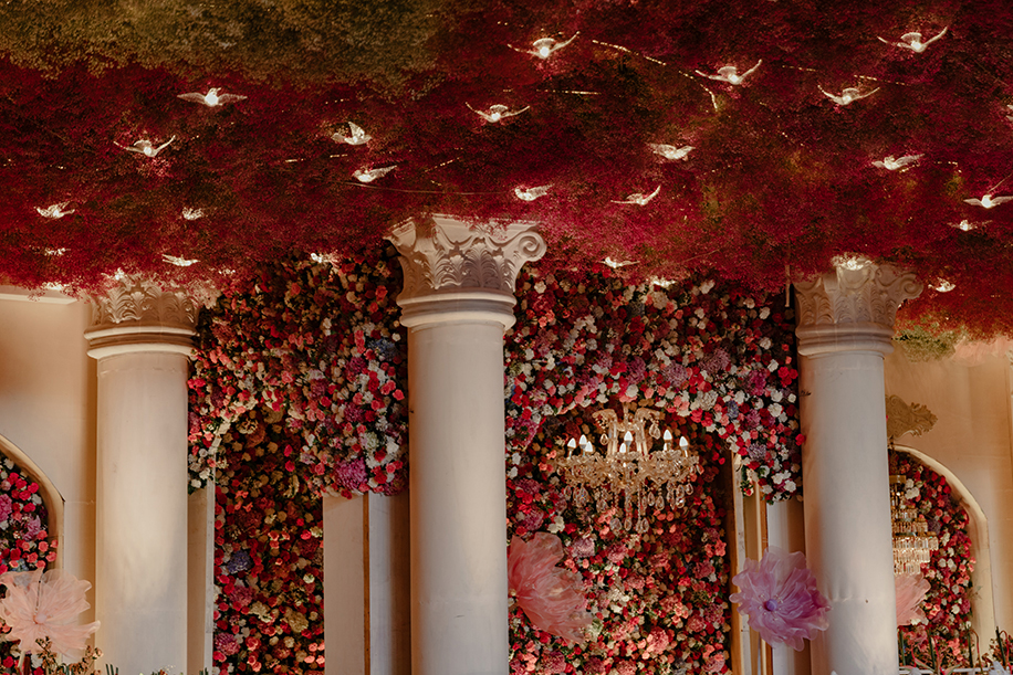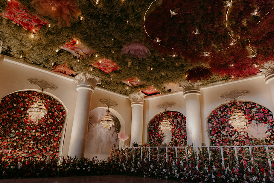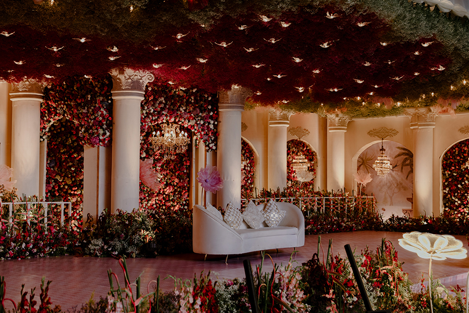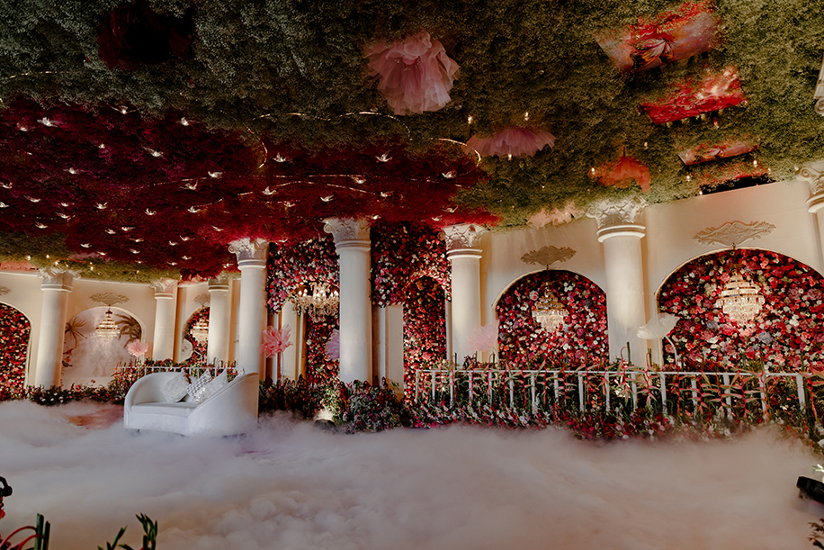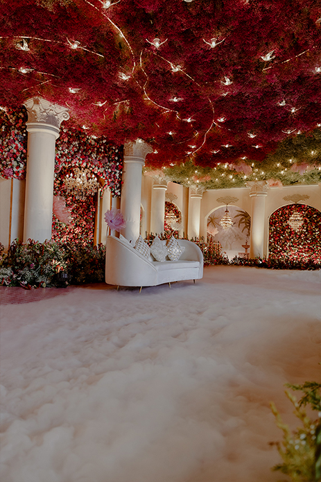 This impressive occasion saw a gargantuan effort comprising over 50 varieties of props, 5000 meters of fabric, 14000 man hours, and 500000 exotic flowers from across the world, all of which came together to transform an area of 40000 sq ft. into Palais de Grandeur for 2500 guests.