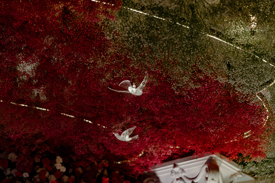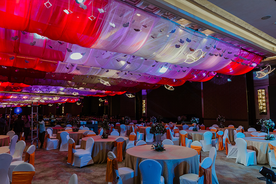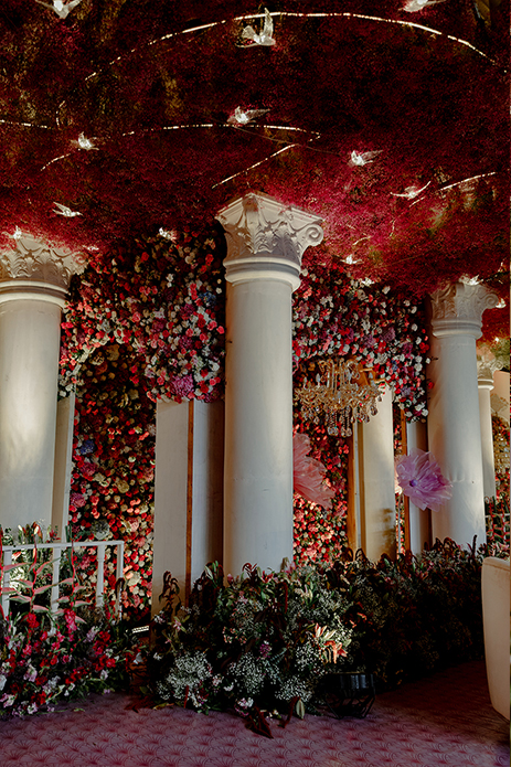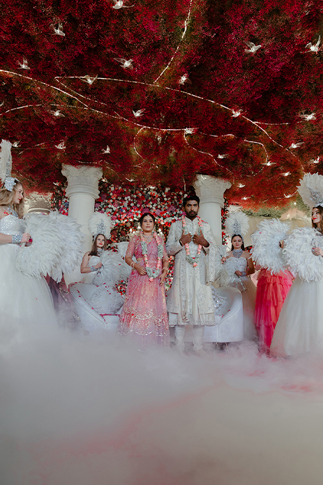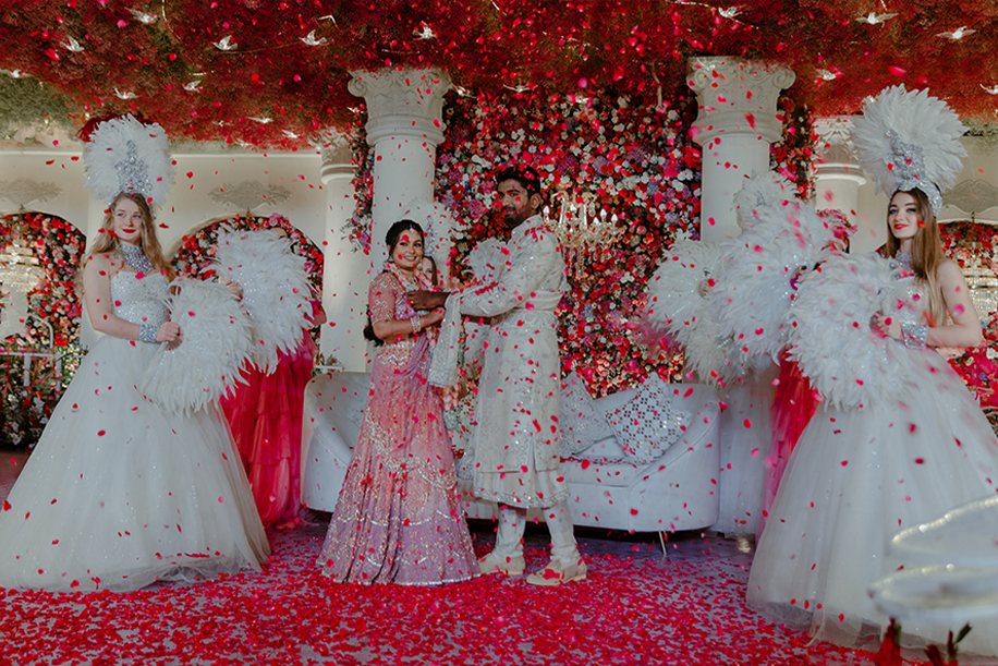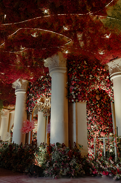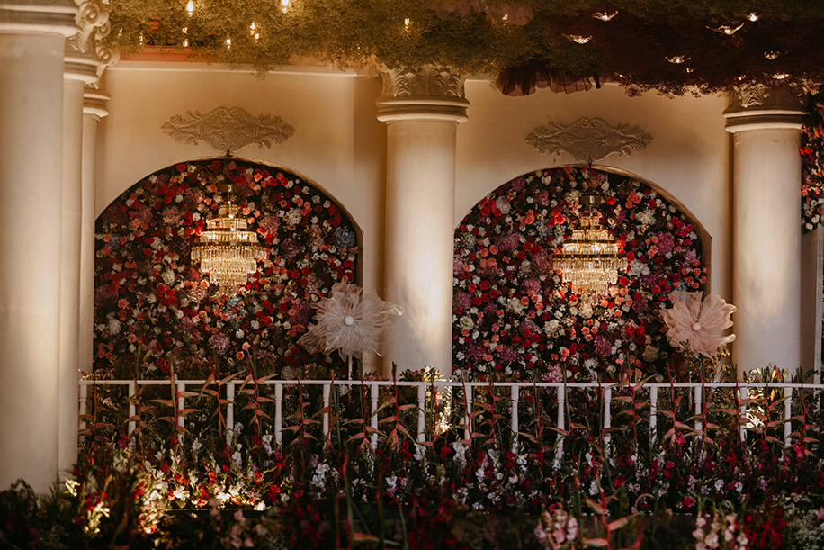 This impressive occasion saw a gargantuan effort comprising over 50 varieties of props, 5000 meters of fabric, 14000 man hours, and 500000 exotic flowers from across the world, all of which came together to transform an area of 40000 sq ft. into Palais de Grandeur for 2500 guests.