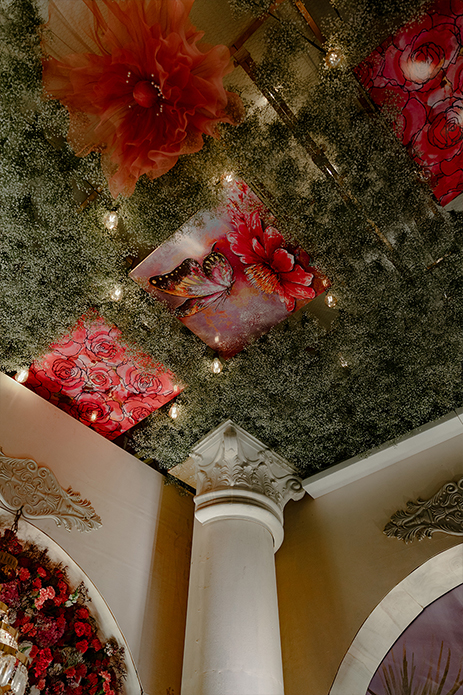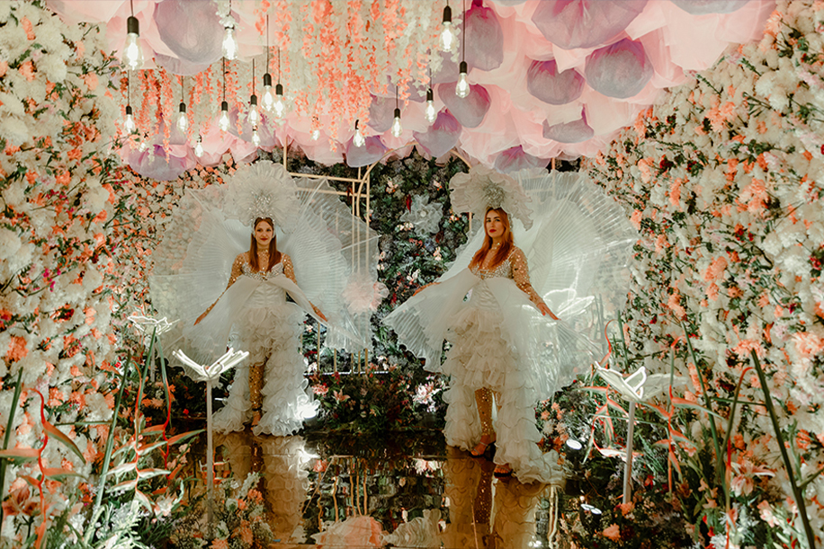 meadow by the water, with reflections of flowers in the mesh above. Russian dancers flown in performed a musical concert through the evening, while others dressed up as flowers themselves to welcome guests. A noted veena artist had everyone enraptured with her melodious tunes. It was a night to remember!