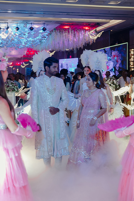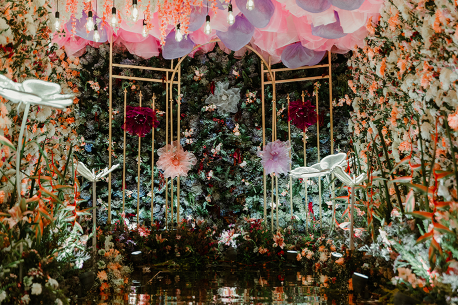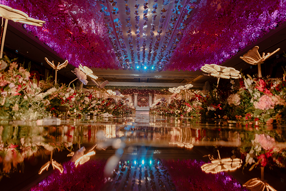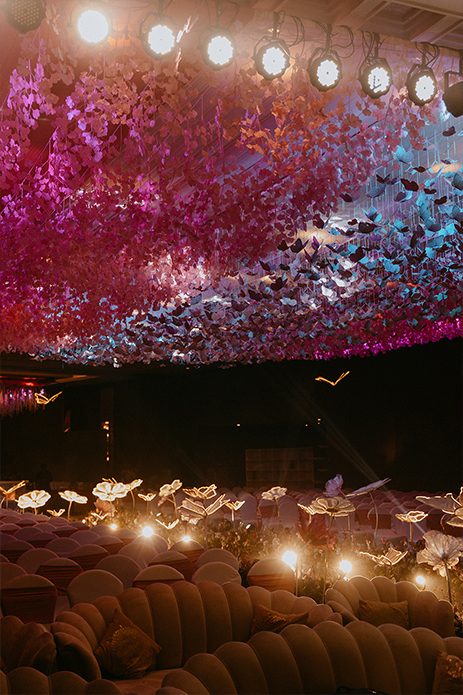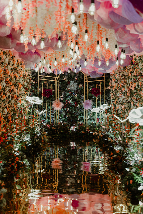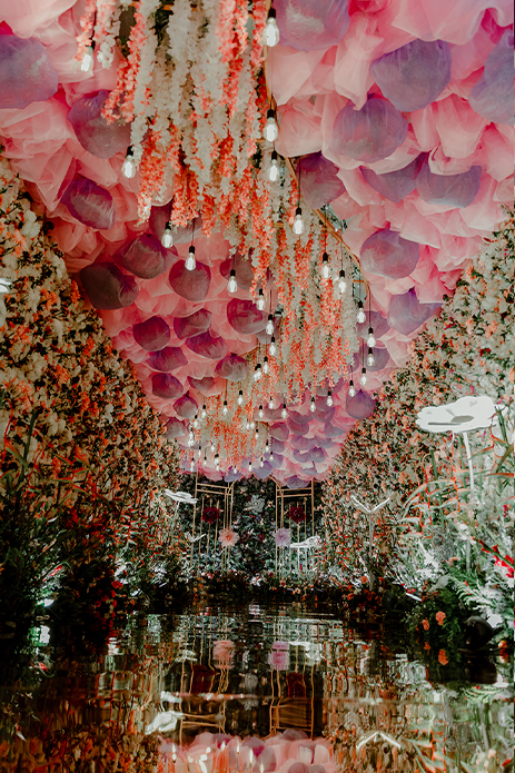 The guests walked through a mesmerizing entry tunnel that opened up to a floral wonderland. Imagined with a massive 96 feet backdrop of flowers and chandeliers as well as a jaw-dropping stage canopy curated with thousands of flowers and neon birds, it was like stepping into another realm. The mirrored aisle was flanked by stunning installations of butterflies and flowers that gave one the feel of walking through a