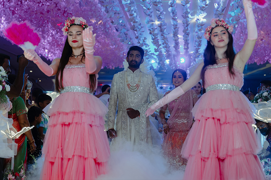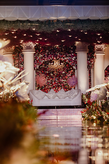 Hosting it at the magnificent property of ITC Grand Chola in Chennai, the couple envisaged their reception with a French palatial theme. With a stunning property at their disposal, they wanted to create a work of art with lots of fresh flowers, life-sized structures, fabrics, and hangings. With a clear grasp of the aesthetic they wanted, they also had specific requests for the type of flowers, a long walkway mirror aisle leading up to the main stage, and an entourage of Russian dancers from Russia to jazz up their entry. With a planning-and-prep period of 3 months and 48 whole hours of execution, the team of The Wedding Experience went above and beyond to ensure every detail was masterfully designed and executed.