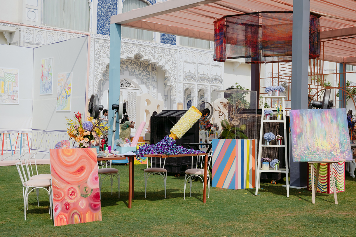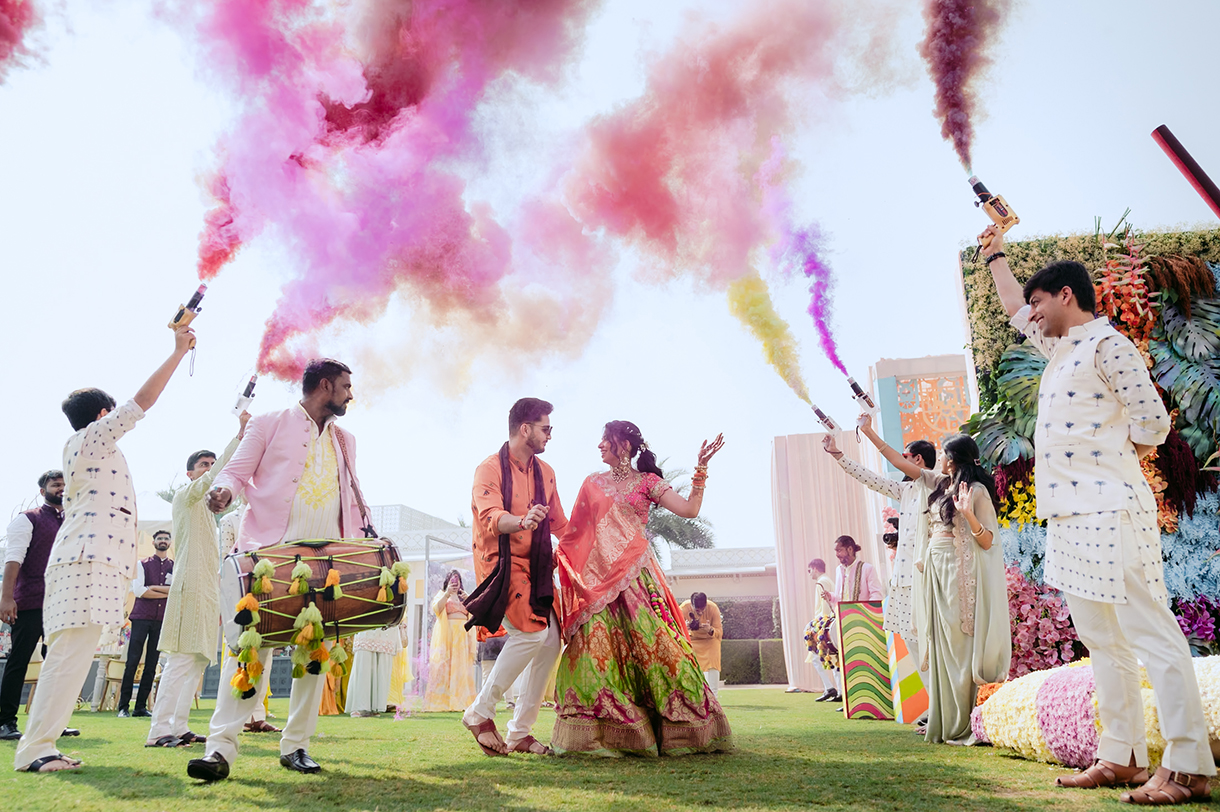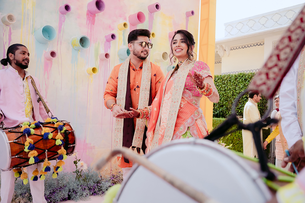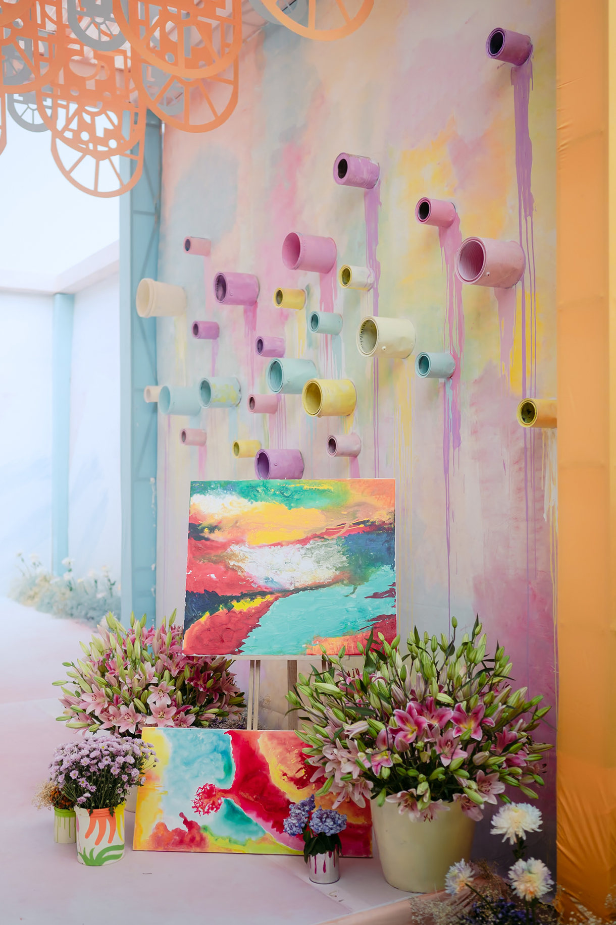 Artistic splashes of vibrant hues and Italian-inspired elements made this couple’s artistic haldi celebration a visual treat!