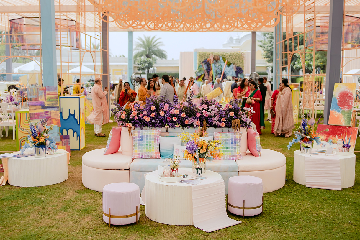 Stepping away from the monotony and embracing many hues instead of the usual yellow and white themed celebration, Ashuli and Anurag’s haldi celebration was an ode to the family’s love for colors. Planned by WeddingSutra Favorite – Zesst Events and Weddings, the event showcased themes inspired by Italy, and artistic elements with a traditional Indian twist.