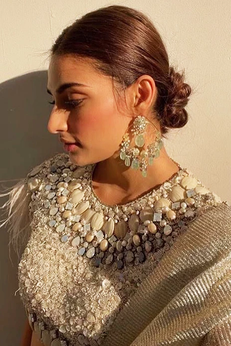 Actor Athiya Shetty attended her best friend’s wedding ceremony in a head-turning ivory pre-draped sari from Tarun Tahiliani’s latest collection and this aesthetic is so new-gen! If we are going to get more millennials to fall in love with a sari, what better way than something which is a perfect blend of quintessential classic silhoutteand a touch of modernity. The glittery sari was teamed with an intricately embroidered blouse with stone work along the neckline, and also featured white feather detailing on the sleeves. Athiya accessorised her look with oversized earrings by Falguni Mehta and a vintage watch.