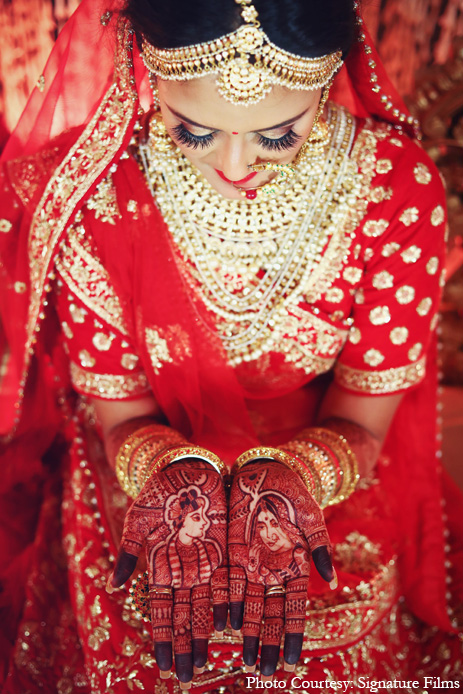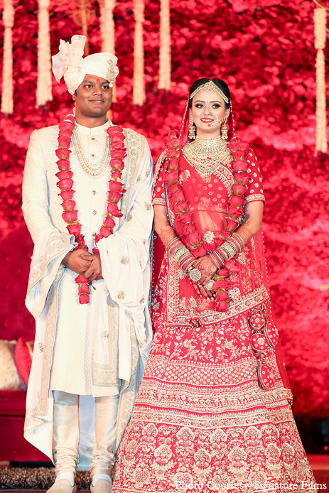 The wedding decor was resplendent with festive shades of red. Drapes embossed with Hindu mantras and elaborate flower arrangements brought all the more attention to the magnificent stage which was decked with huge chandeliers. The bride wore a bright red lehenga with layered traditional jewellery while the groom donned a complementing cream colored sherwani for the wedding ceremony.