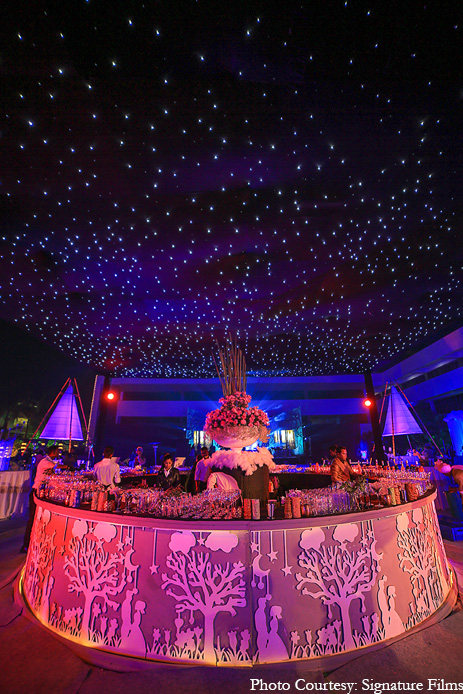 The vibrant mehndi ceremony gave way to an elegant yet glamorous sangeet with pretty lights and glittering strips dangling from the ceiling. Hundreds of fluorescent light bulbs lit up the pathway to the central setup. Avantika, Karan, and their guests had a marvellous time watching the impressive dance performances by members of the couple’s entourage. The highlight of the evening, however, was the bride’s dance using a floral carriage as the prop which left everyone cheering.