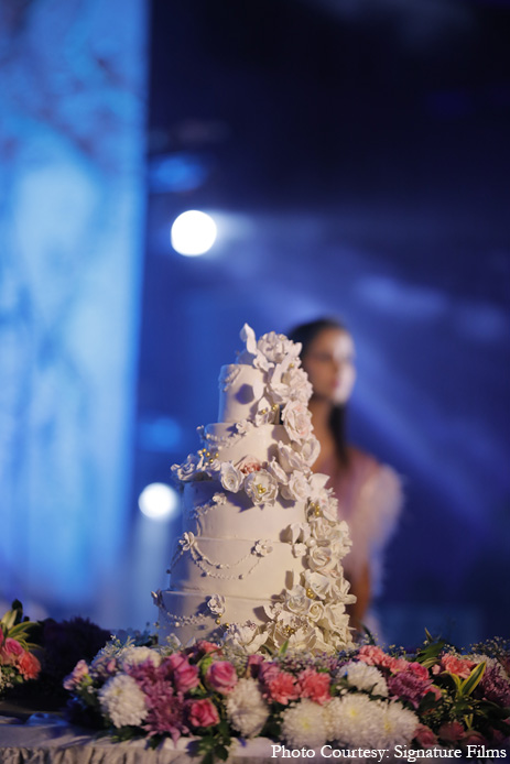 The traditional haldi ceremony was followed by a dreamy cocktail celebration. The decor matched the cool vibe of the chilly winter night. Floral arrangements added to the gorgeous decor, and even the delectable five-tiered cake was decorated with floral accents.