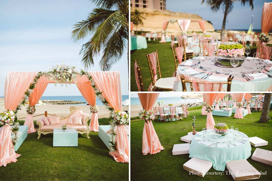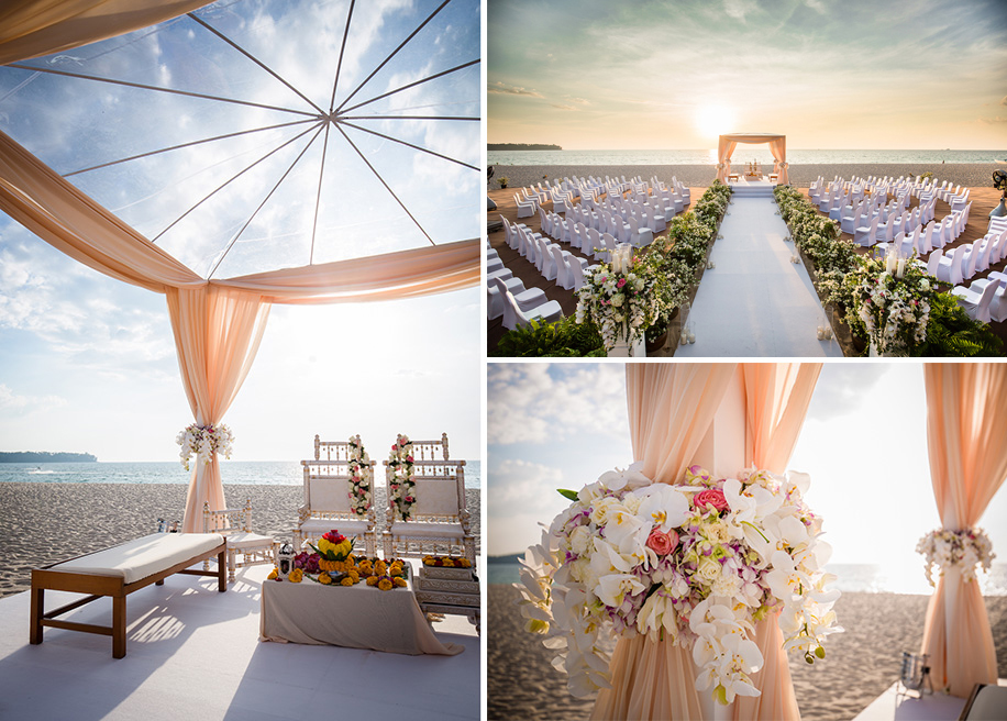At the wedding ceremony, the decor was nothing short of picture-perfect. The white walkway to the beachside mandap where the sunset wedding ceremony took place was festooned with lush floral arrangements and lit up with fairy lights and candles in hurricane holders. Blush drapes and a transparent canopy gave the mandap a very minimalist look.