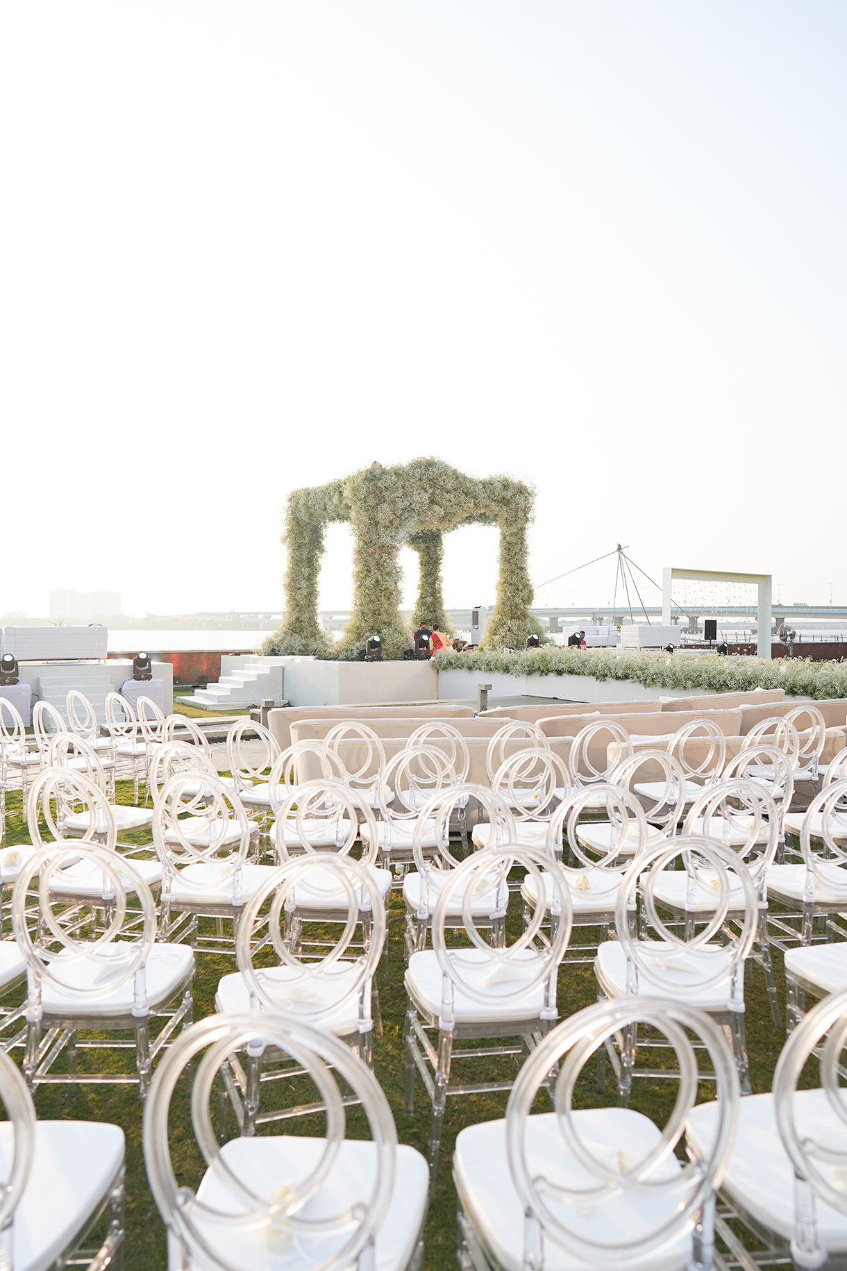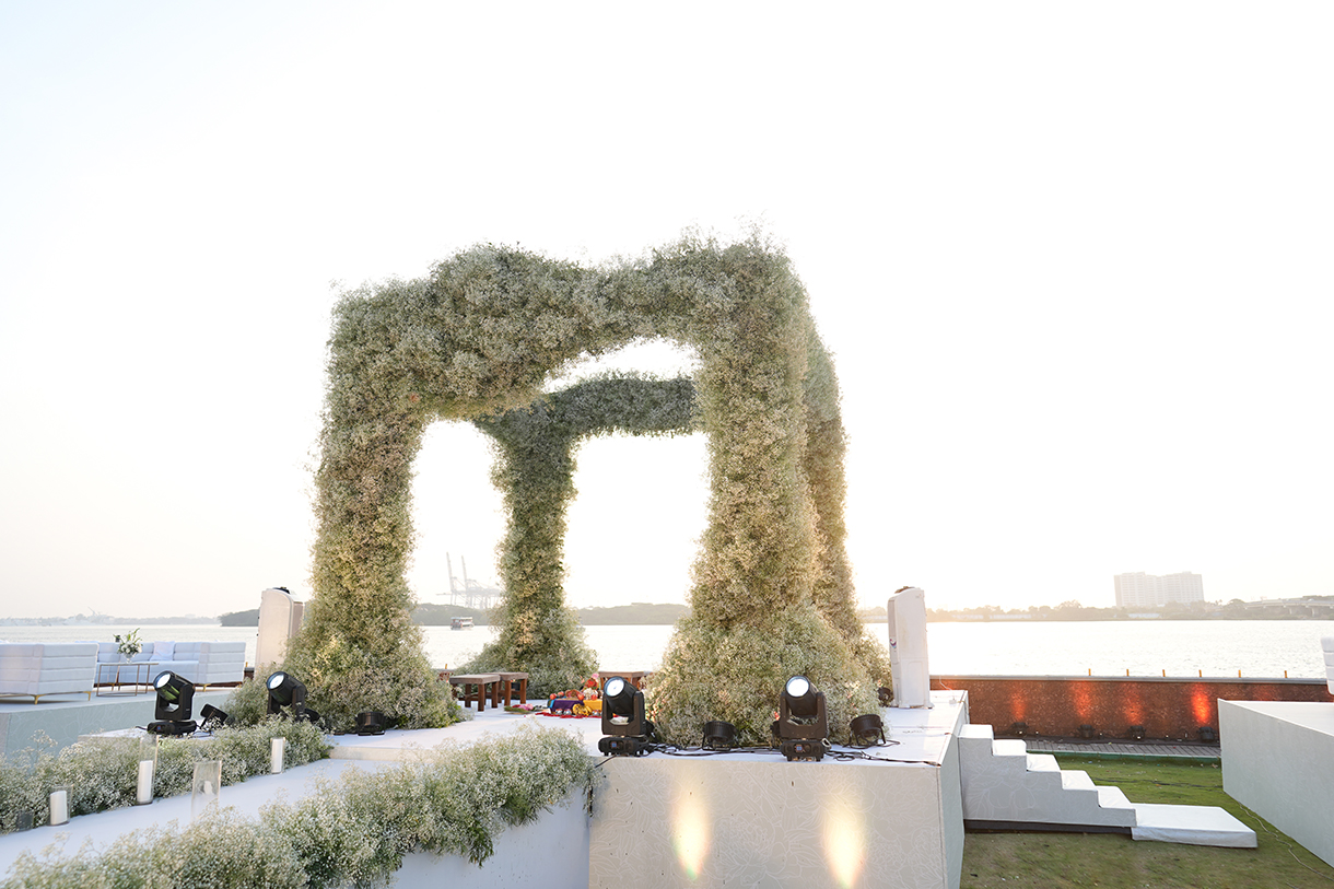 Bedecked with thousands of gypsos blooms, this waterside wedding mandap will take your breath away!