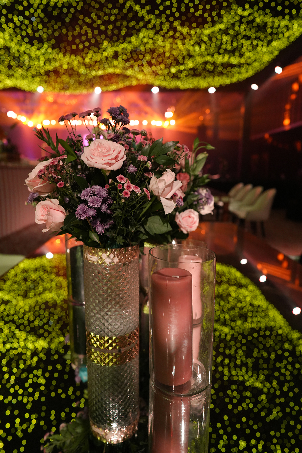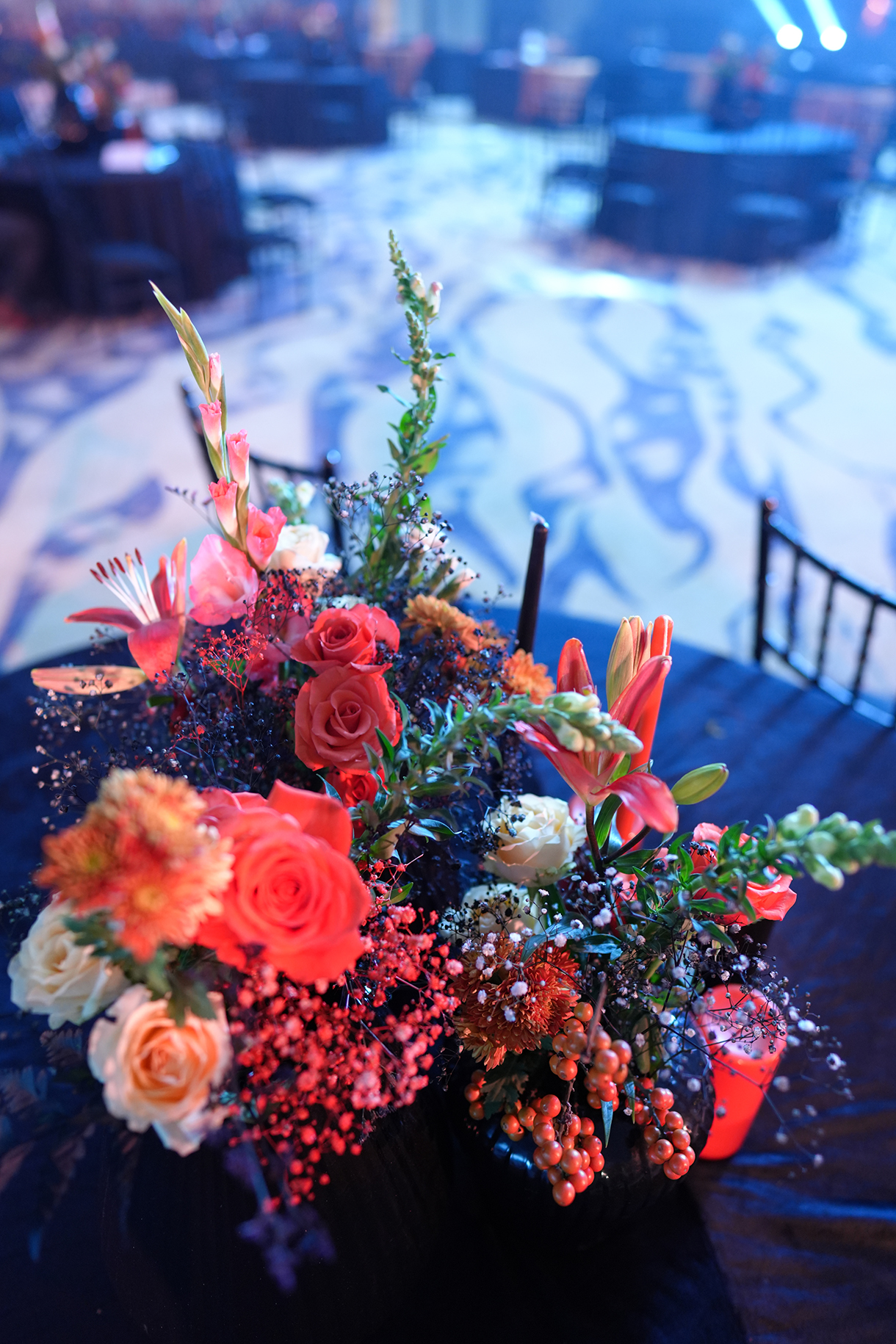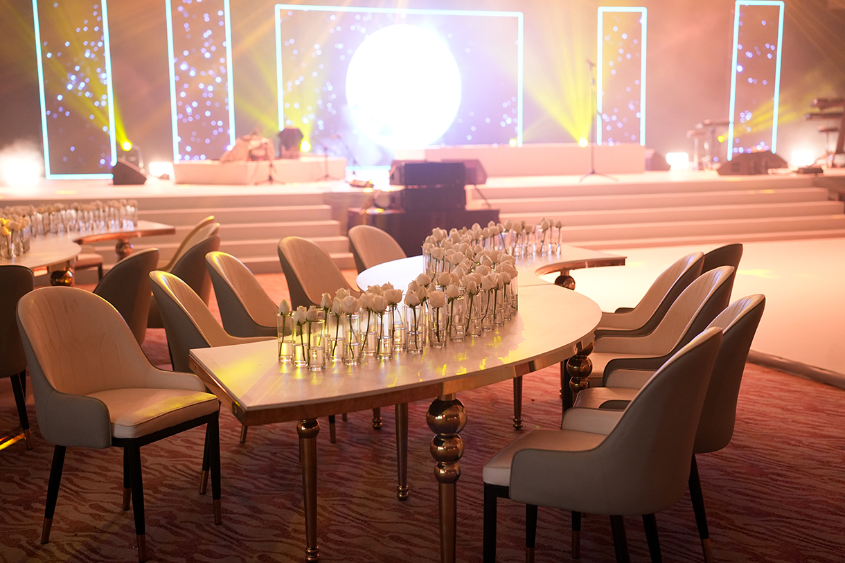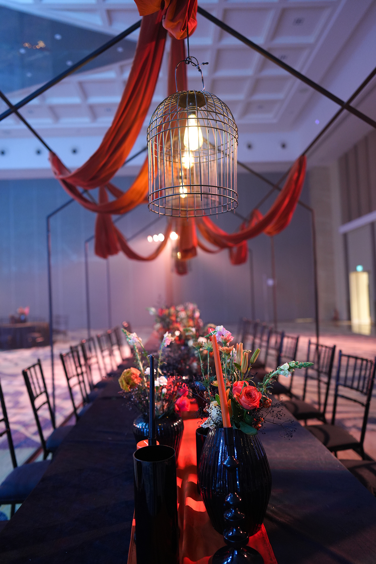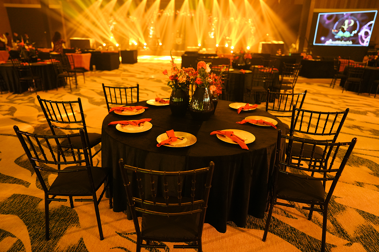 The welcome dinner embraced a sophisticated theme with chic black and rust colors. Floral centerpieces adorned the dining area, featuring black fluted vases and rust-coloured flowers that complemented the elegant black Tiffany chairs. Guests were seated on plush black sofas, accented with rust cushions and throws.