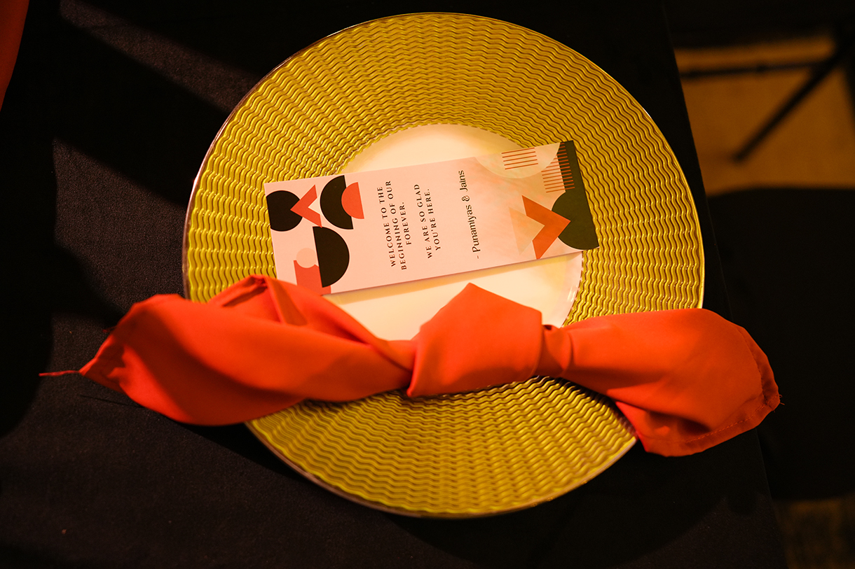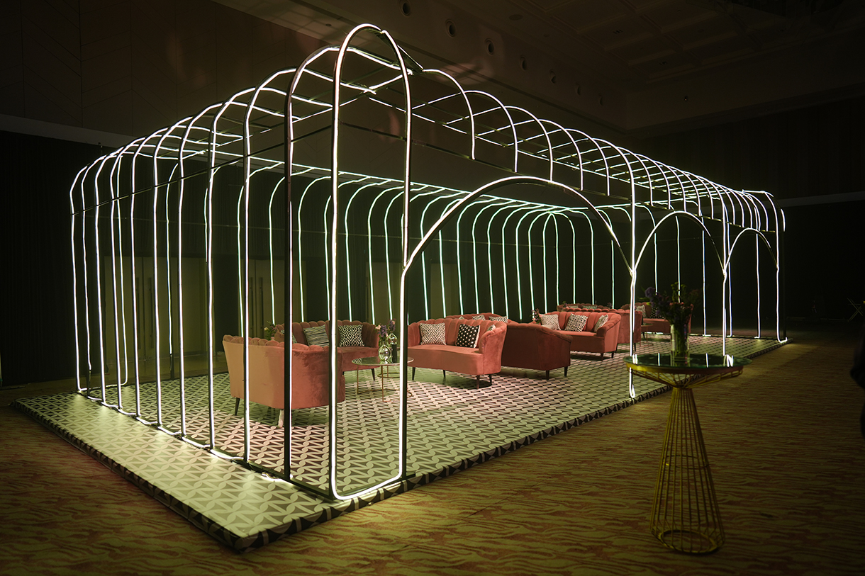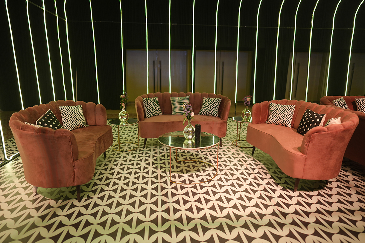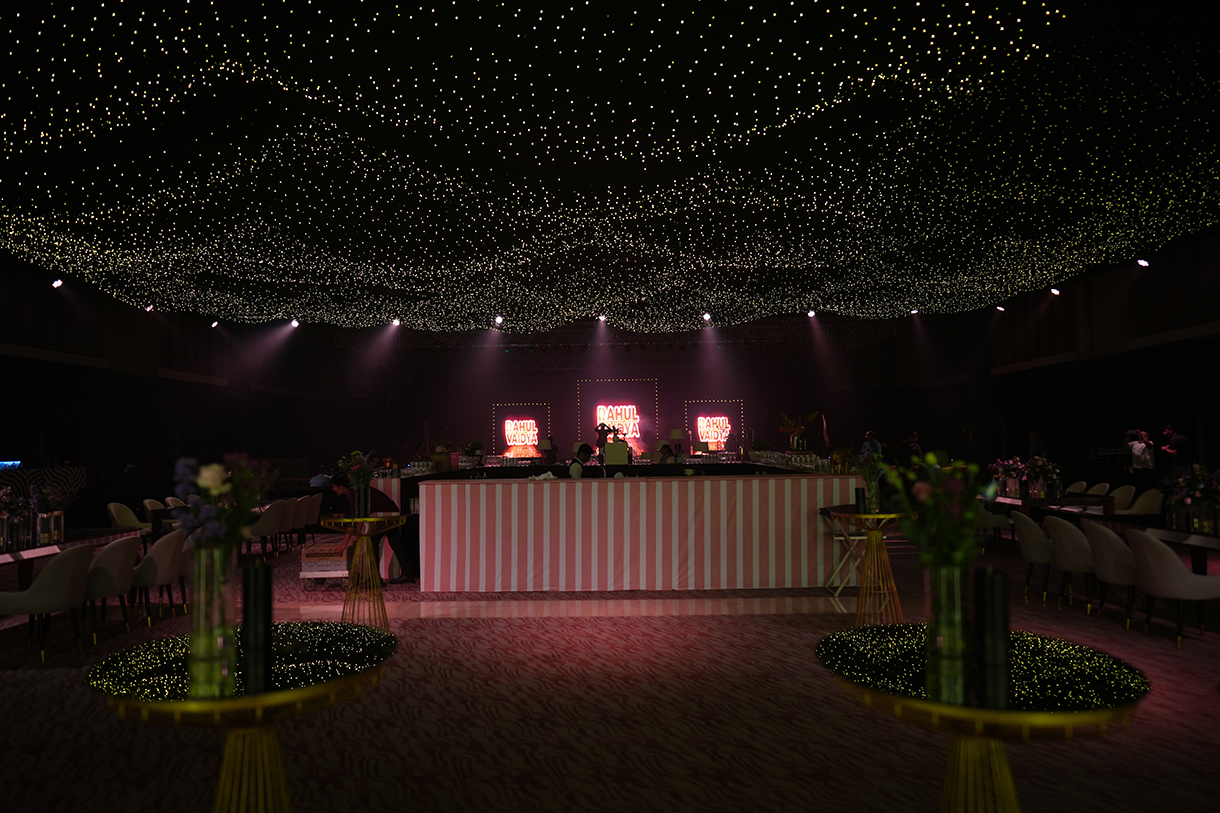 Salmon pink arches, a sparkling ceiling with lights shining like stars and a monochrome geometric print floor ensured the sangeet put everyone in the mood to groove. LED lights lit up the main stage while the seating areas popped with neon lights. Delphinium flowers and white lamps were a part of the couple’s seating area, adding a touch of romance.