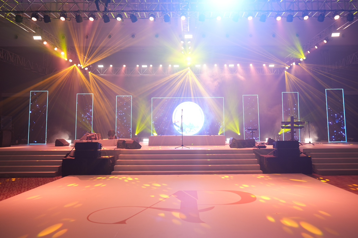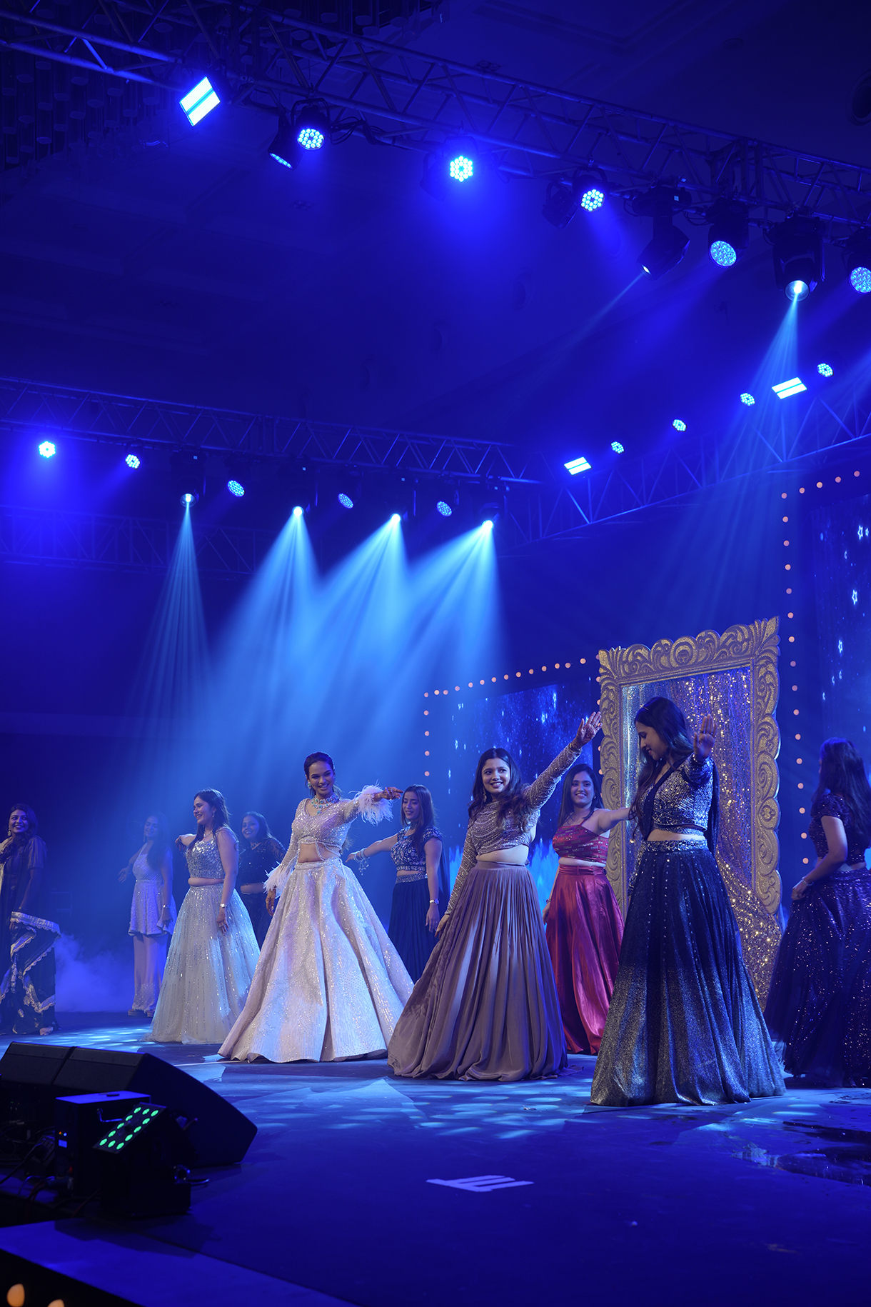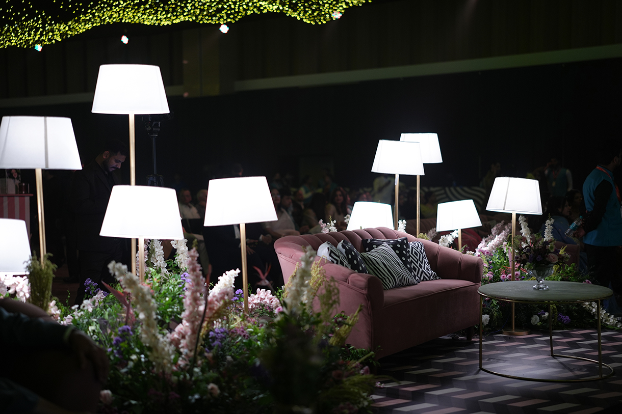 Salmon pink arches, a sparkling ceiling with lights shining like stars and a monochrome geometric print floor ensured the sangeet put everyone in the mood to groove. LED lights lit up the main stage while the seating areas popped with neon lights. Delphinium flowers and white lamps were a part of the couple’s seating area, adding a touch of romance.