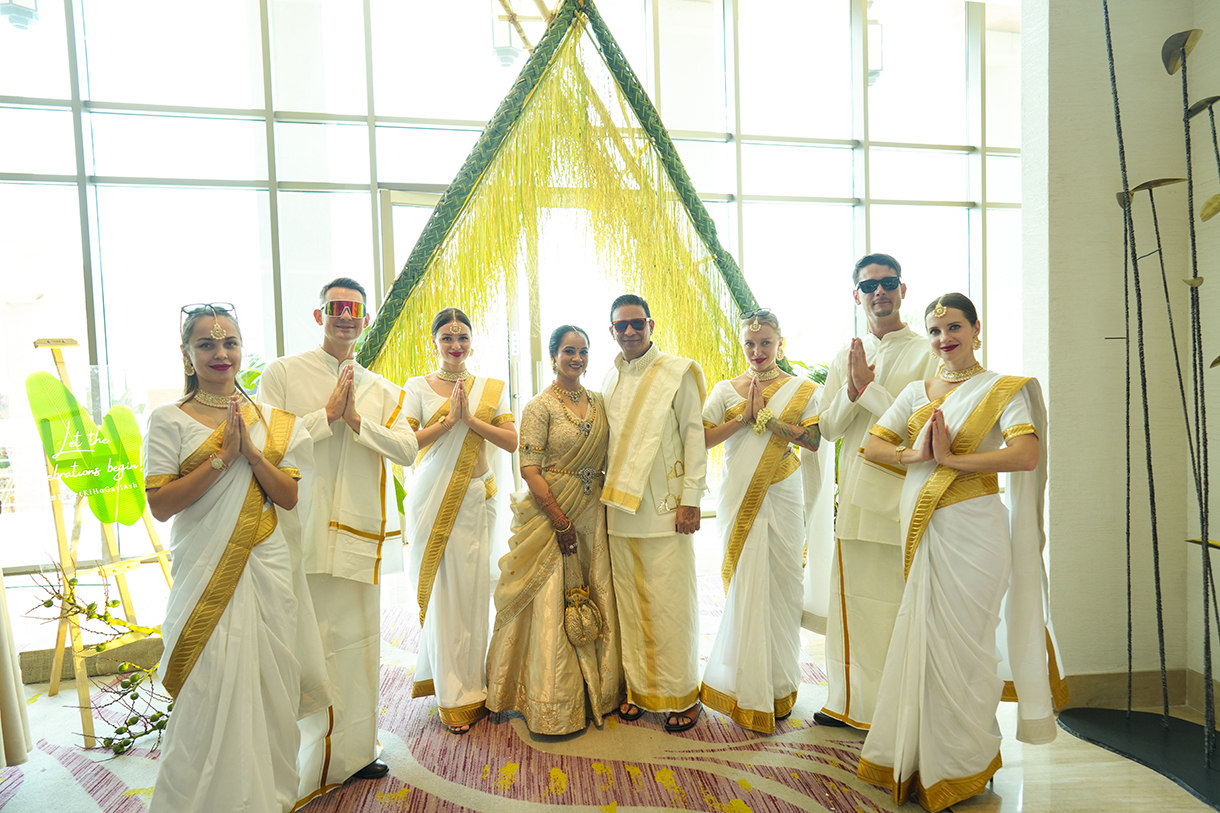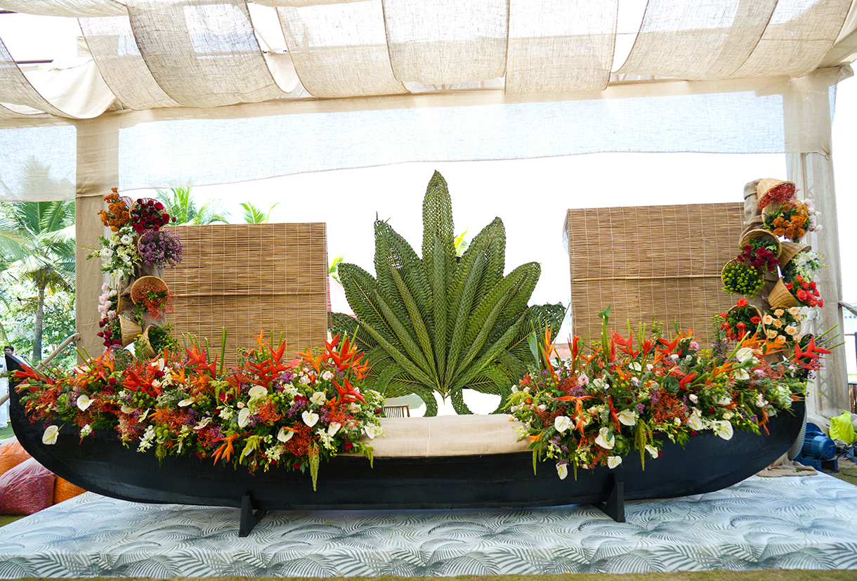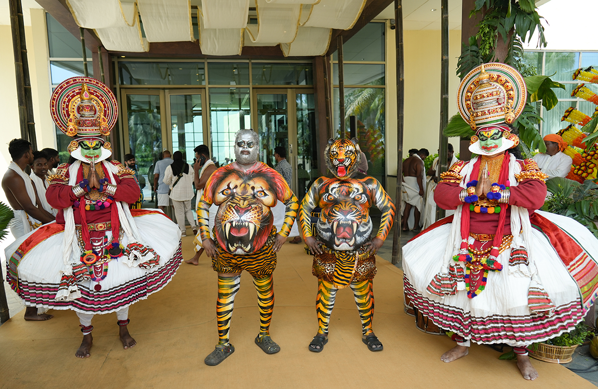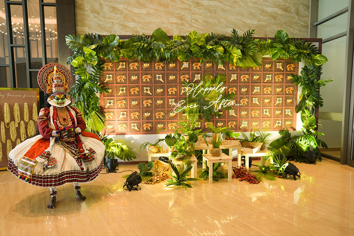 The guests were greeted with a Kerala-style welcome where taking a cue from the lush landscape of the state, the entrance was adorned with leaves and canes. On the other hand, the ceiling shimmered with the regional Kasavu drapes. The atmosphere came alive with traditional Pookavadi, Pulikali, and Kathakali performances, adding a touch of regional magic to the event.