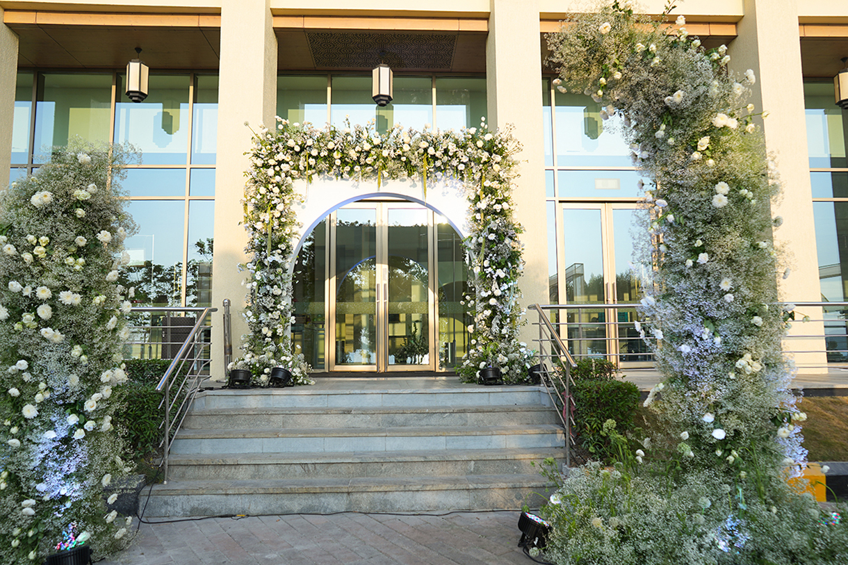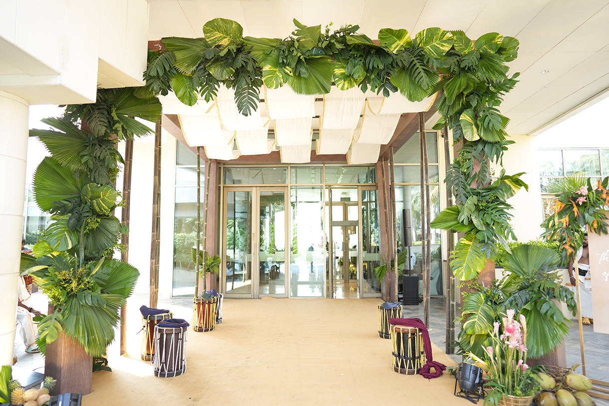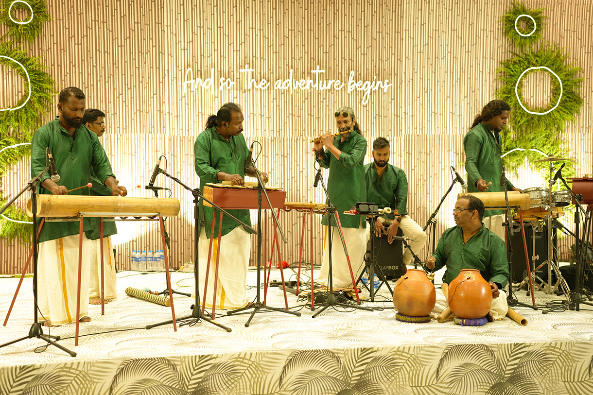 The guests were greeted with a Kerala-style welcome where taking a cue from the lush landscape of the state, the entrance was adorned with leaves and canes. On the other hand, the ceiling shimmered with the regional Kasavu drapes. The atmosphere came alive with traditional Pookavadi, Pulikali, and Kathakali performances, adding a touch of regional magic to the event.