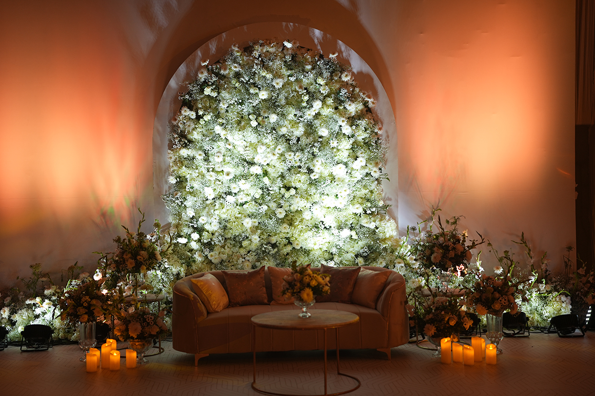 Team Watermark Weddings shares, “Imagine stepping into a dreamy wedding varmala ceremony where every detail is a whisper of elegance. The mandap, a vision of floral enchantment, is adorned entirely with above 2000 bunches of delicate baby’s breath blooms, exactly as the couple envisioned. For the front seating, off-white cream shades sofas added a touch of sophistication.” After the wedding, the guests were ushered indoors where baby’s breath blooms were also generously used along with an ivory decor theme.